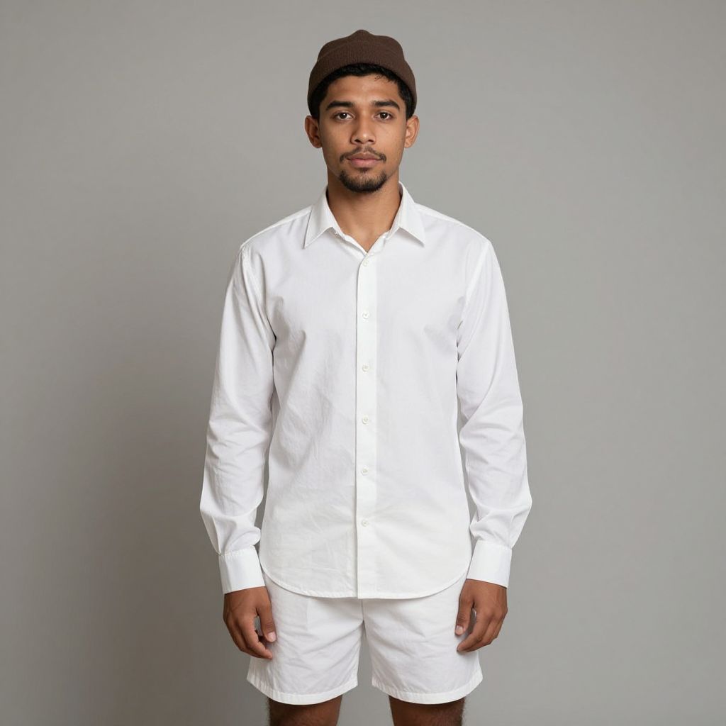 Photograph of a young South Asian man standing against a plain gray background. He has medium brown skin, short black hair, and a trimmed beard. He wears a white long-sleeve button-up shirt and matching white shorts, both made of a lightweight, slightly wrinkled fabric. His expression is neutral, and he looks directly at the camera. His hands are relaxed by his sides. The overall style is minimalist and modern, with a focus on the contrast between his white clothing and the gray background.