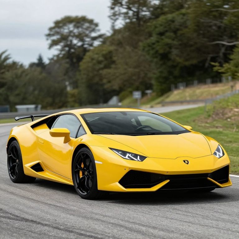 Photograph of a bright yellow Lamborghini Aventador on a winding, tree-lined road. The sleek sports car has sharp, angular lines, black-tinted windows, and black alloy wheels with yellow accents. Its aggressive front grille and narrow, slanted headlights give it a fierce look. The background features a blurred, green forest with tall trees under an overcast sky, adding a sense of motion as the car speeds forward. The road is gray and textured, enhancing the car's vivid color. The image captures the car in mid-motion, emphasizing its speed and dynamic design.