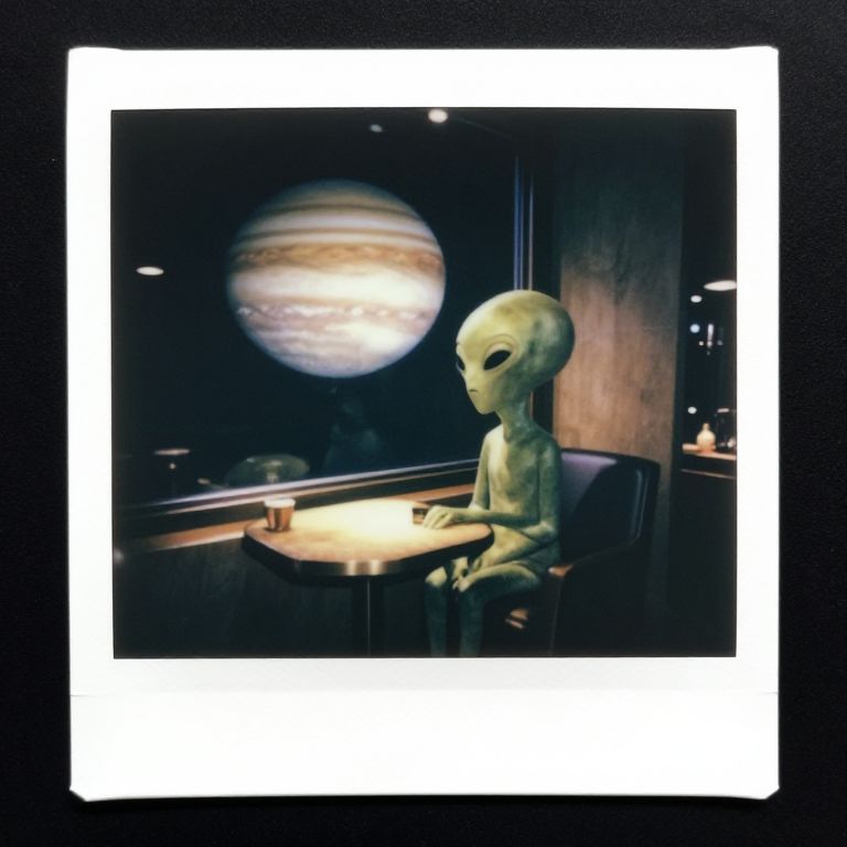 Sumi-E retro polaroid photograph of a sad alien sat in a space cafe looking out the window at planet jupiter,