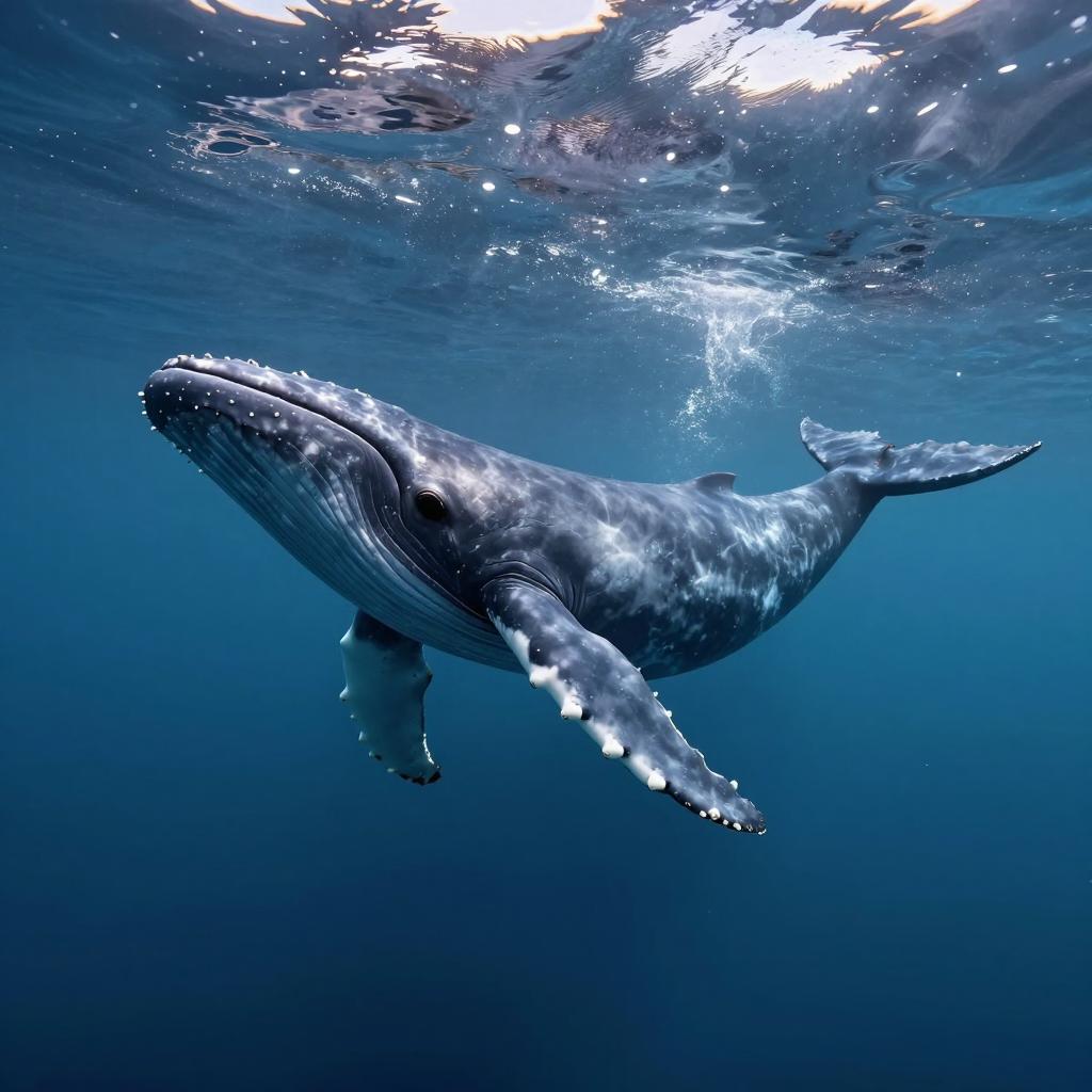 Young boy with light brown hair wearing a patterned black and white jacket gently touching the head of a glossy black and white orca whale in a pool. The boy leans forward with focused expression, set against a bright blue water background under sunlight.