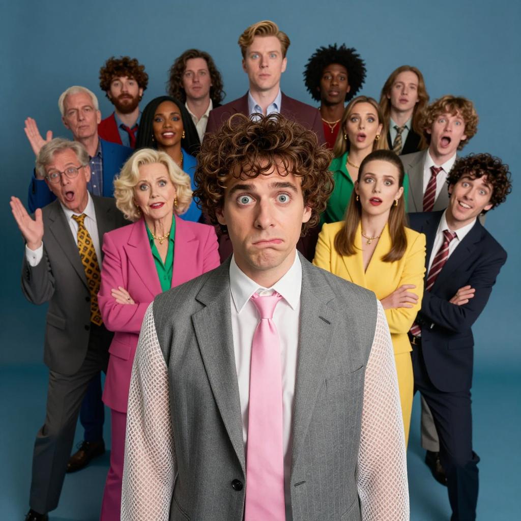 A man in a grey pinstripe suit with fishnet sleeves, white shirt, and pink tie, front and center. He has curly brown hair, large eyes, and a slightly confused expression. Behind him, eleven people of varying ages and appearances, wearing colorful, eclectic clothing, stand and pose with energetic expressions. The background is a solid blue gradient.