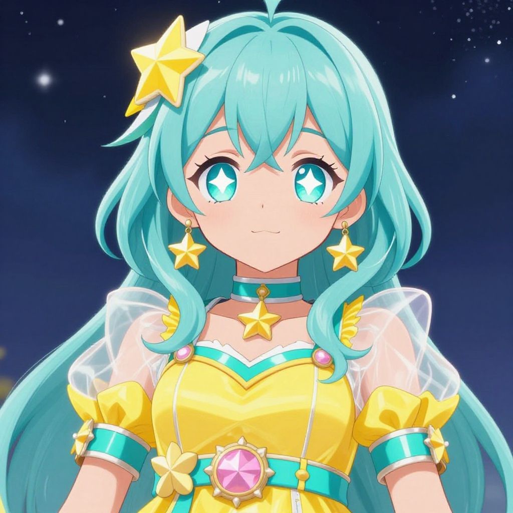 This digital anime-style illustration features a young girl with long, flowing turquoise hair adorned with a yellow star hair clip. She has large, sparkling blue eyes and wears a yellow, star-themed dress with puffed sleeves and a pink gemstone brooch at the center. Her outfit is accessorized with yellow star-shaped earrings, a matching choker, and arm bands. The background is a dark, starry night sky, creating a contrast with her bright attire. The girl's expression is calm and slightly smiling, with a soft, glowing light highlighting her face. The overall aesthetic is vibrant and magical, with a focus on bright colors and celestial elements.