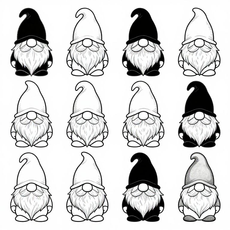 A collection of black and white gnomes clipart, featuring a variety of cute gnome figures with beards and hats, outlined in fine strokes with delicate shadowing, ideal for digital design assets, stickers, and coloring pages