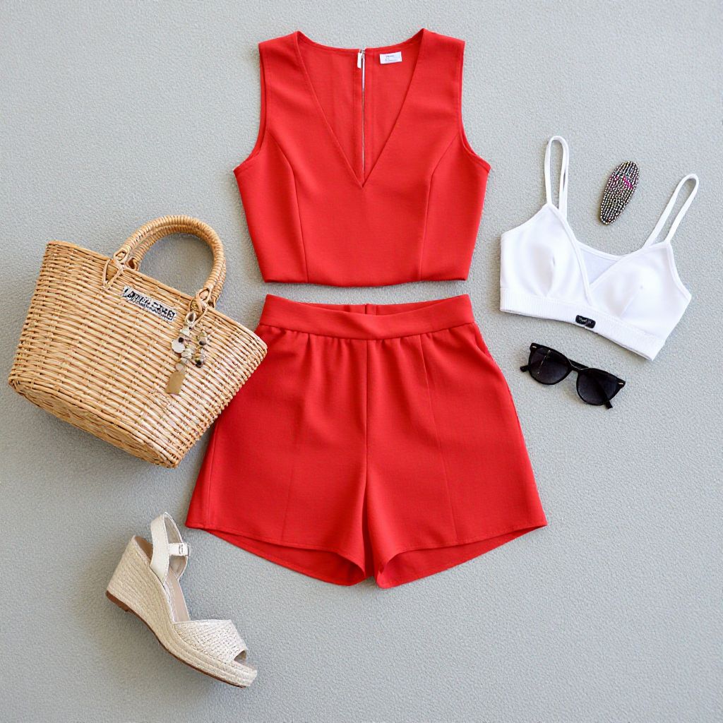 Photograph of a bright red sleeveless top and high-waisted shorts, paired with white crop top, black sunglasses, beige wedge sandals, and