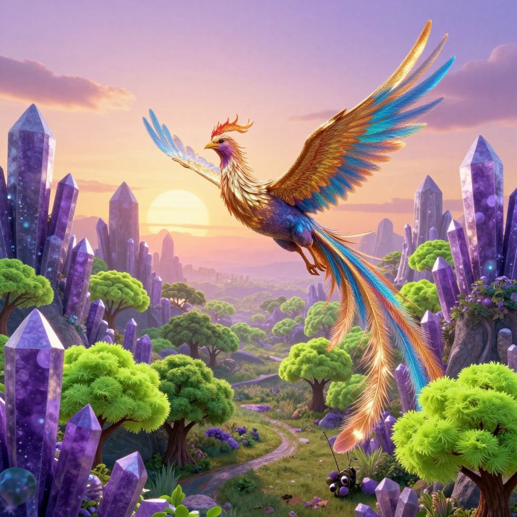 An entrancing digital artwork captures a whimsical scene reminiscent of children's fairy tales and surreal dreamscape, showcasing a phoenix soaring majestically from an insect's perspective. The landscape is adorned with vivid neon-green trees blending into towering purple crystal formations, evoking a gradient of awe and wonder. As the celestial creature glides effortlessly between these fantastical elements, its plumage transitions from shimmering gold to vibrant blue hues, reflecting the warm glow of an otherworldly sunset. This unique viewpoint reveals both the breathtaking beauty of the phoenix and the mesmerizing fusion of nature and mystique within this enchanting dreamscape.