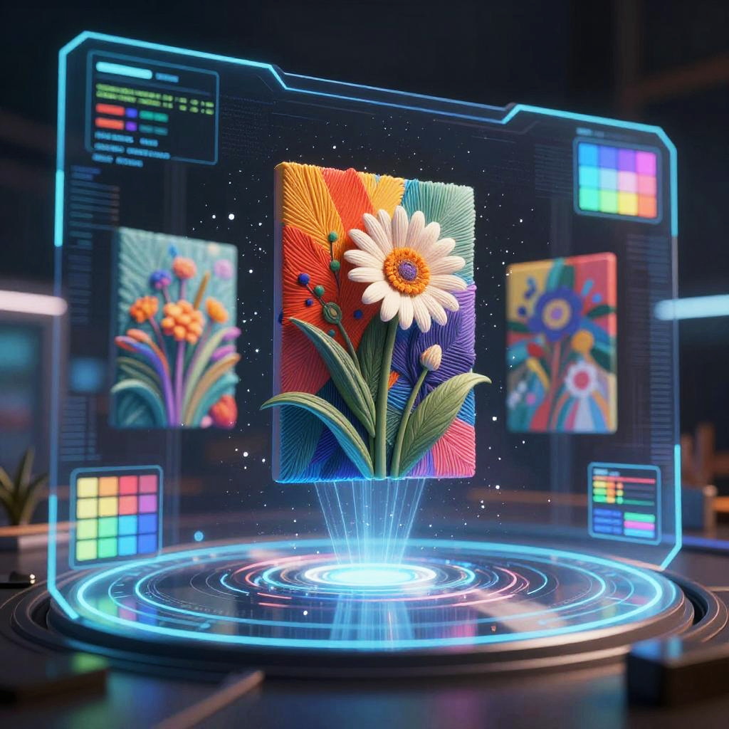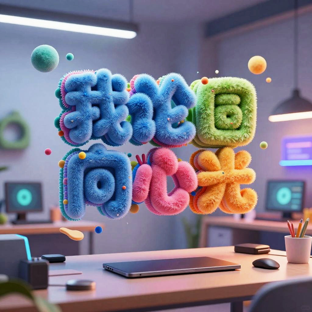 Text to 3D AI concept art featuring a digital artist's workspace where typed text phrases organically morph into vibrant 3D sculptures, floating mid-air in a creative studio filled with advanced tech gadgets, soft ambient lights, and a futuristic artistic vibe.