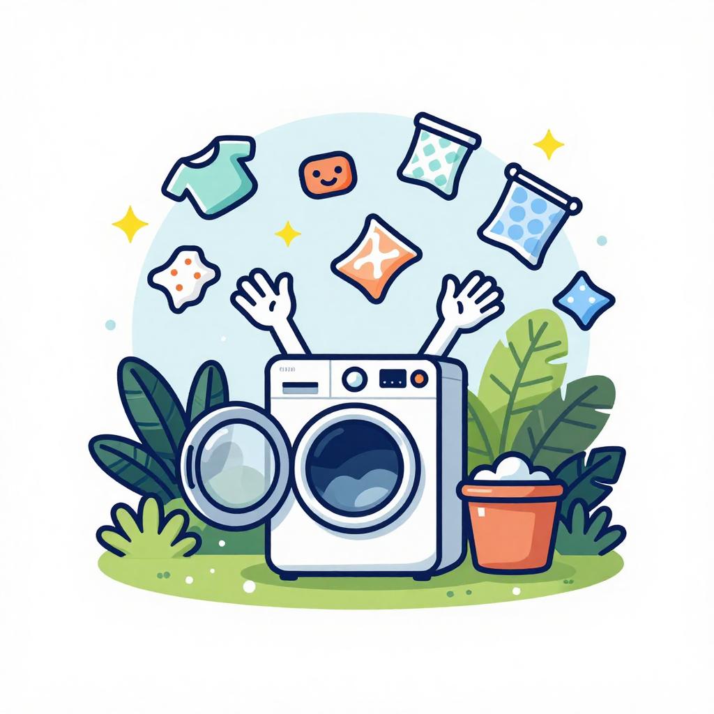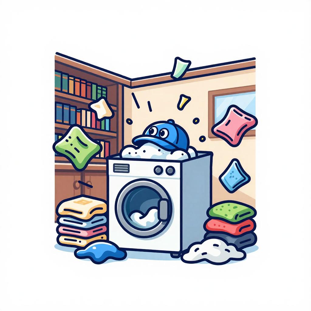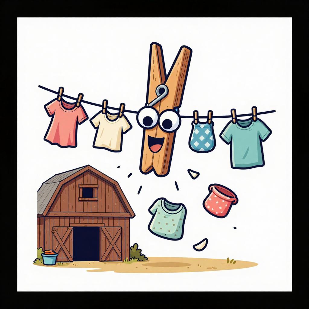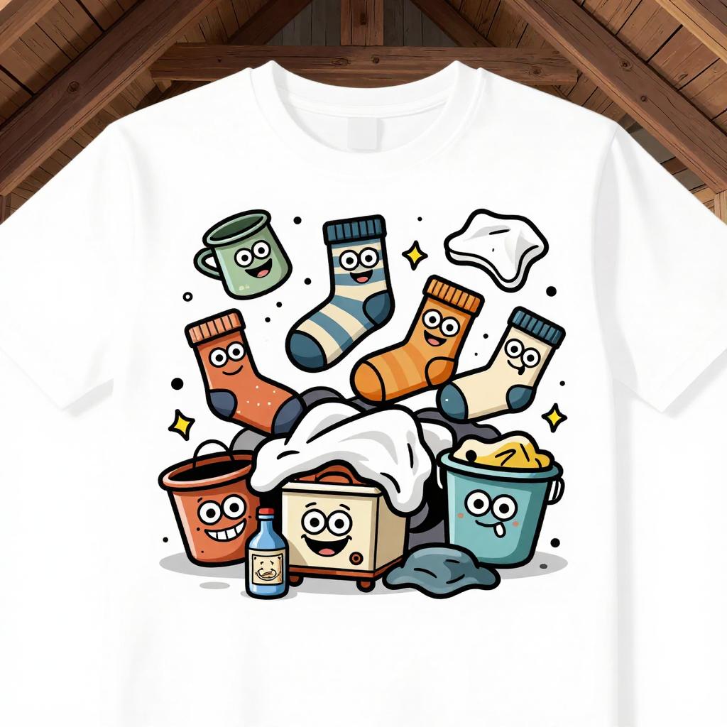 A cartoon illustration of an animated pile of socks with googly eyes and mischievous grins causing laundry items to scatter in a rustic attic full of vintage laundry paraphernalia, conveying a whimsical and lively vibe under dynamic lighting. Vector T-shirt graphic, bold contour lines, flat colors, white background.