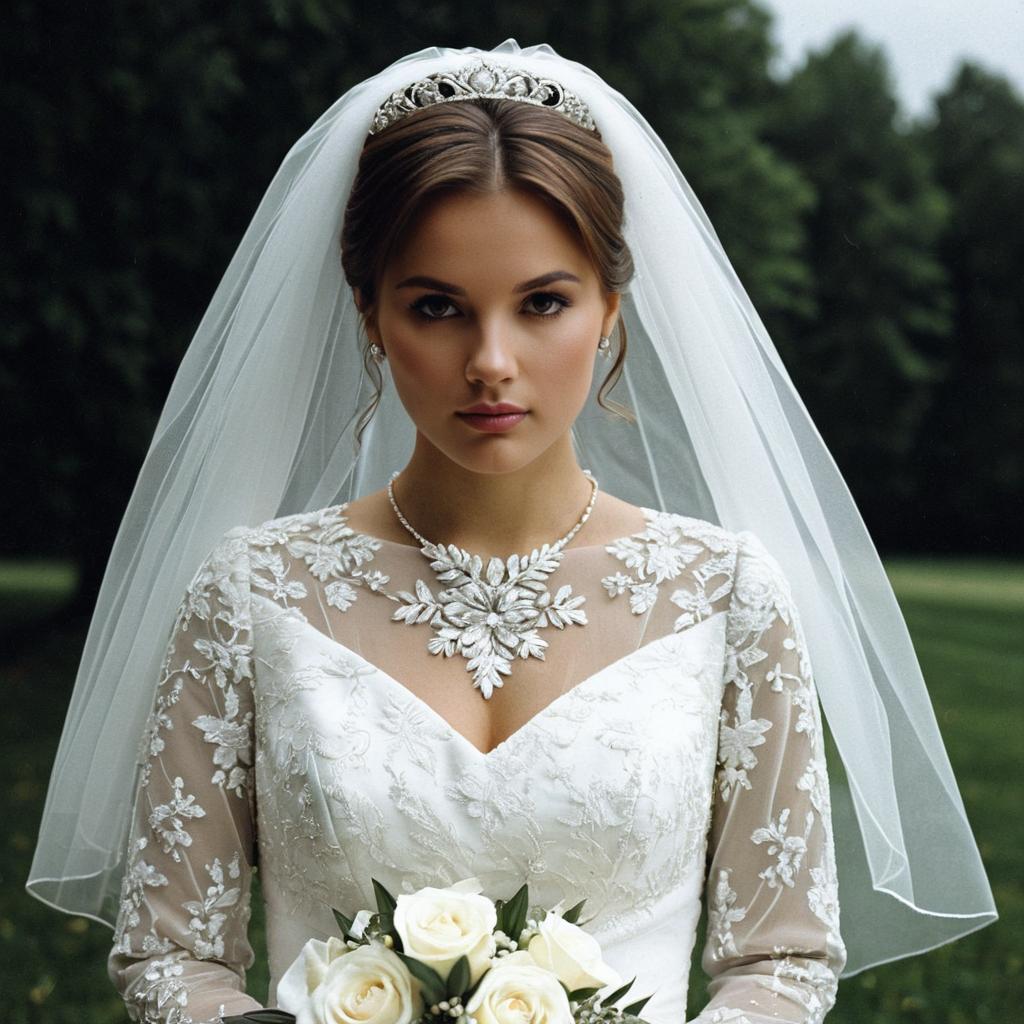 Vintage wedding gowns,1girl, solo, dress, realistic, white dress, brown hair, brown eyes