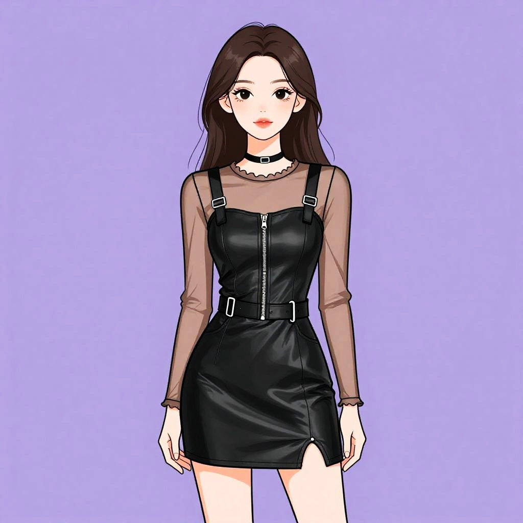 Woman with pretty face and pretty hair. Woman, modern edgy, strapless vinyl mini dress in glossy black, sweetheart neckline, body-hugging silhouette, thigh-length, accessorized with narrow rectangular sunglasses, hair styled in a top bun, white studio background. --sref 1467