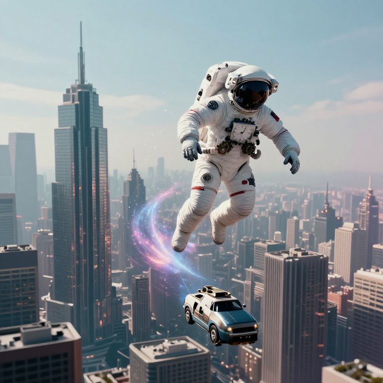 A cyberpunk-inspired digital artwork depicts a lone figure soaring above a bustling urban street, illuminated by golden-hour lighting, as they activate gravity-defying boots, leaving behind a trail of sparkling debris on the sidewalk.