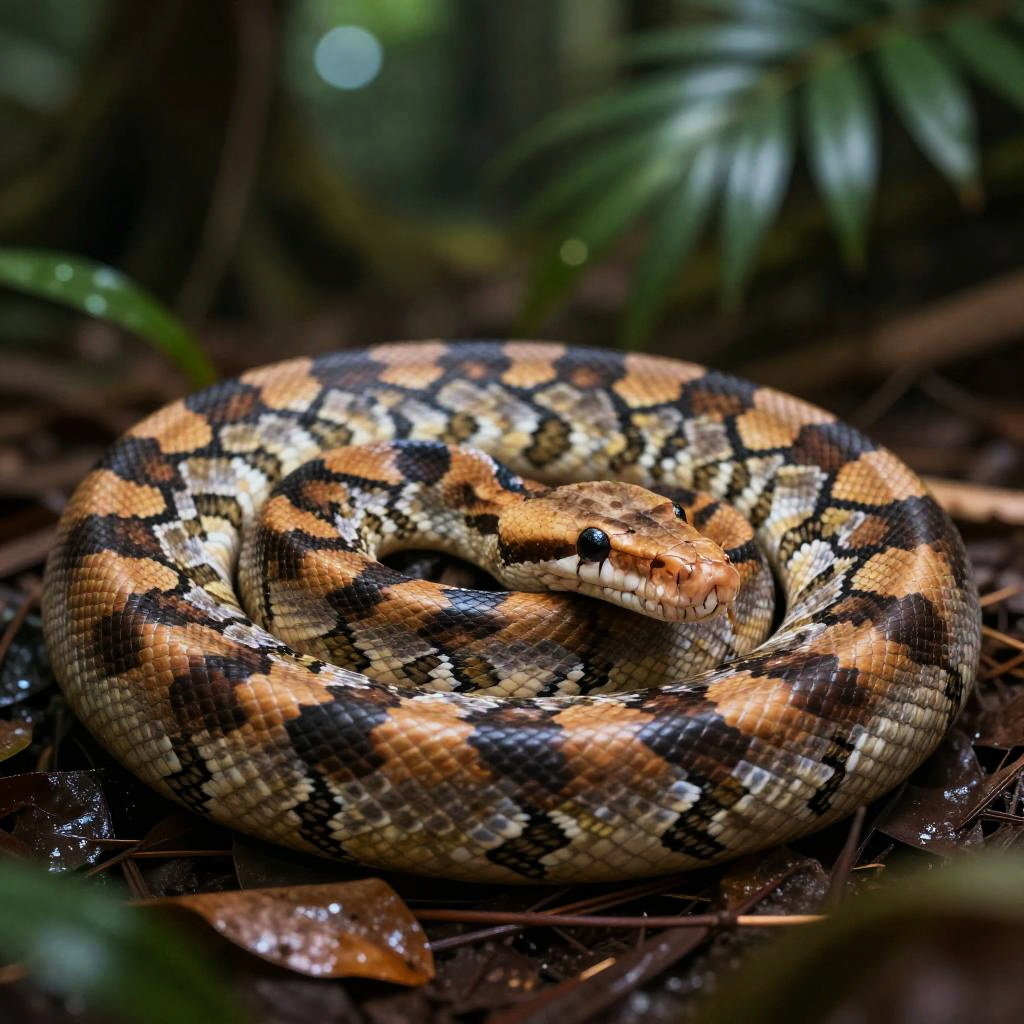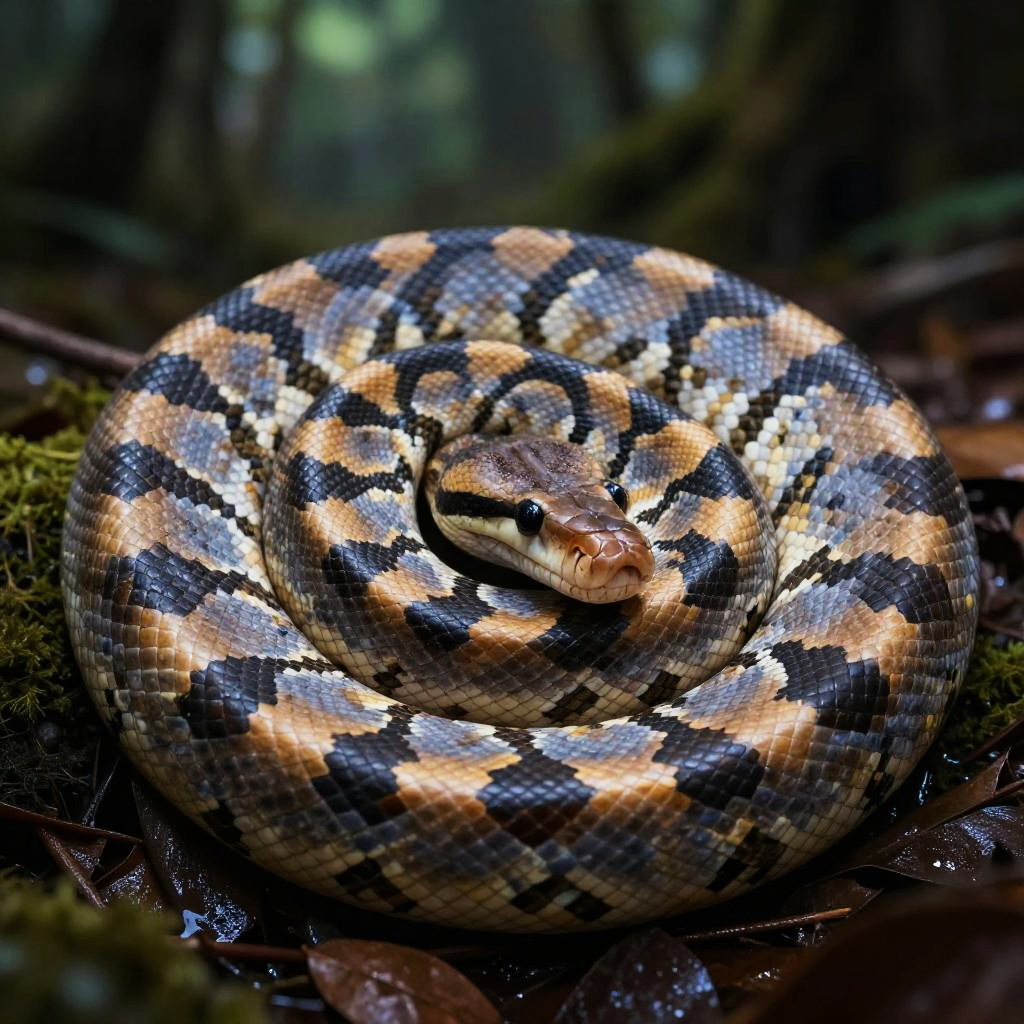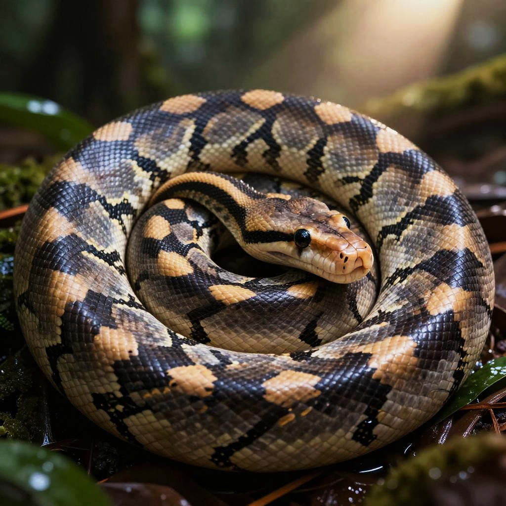 Close-up portrait of a rainbow boa coiled in a spiral in a lush jungle undergrowth, moody lighting, cinematic, vray render, cgsociety, artstation, 4k resolution