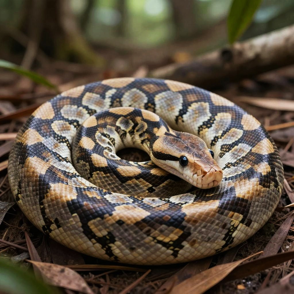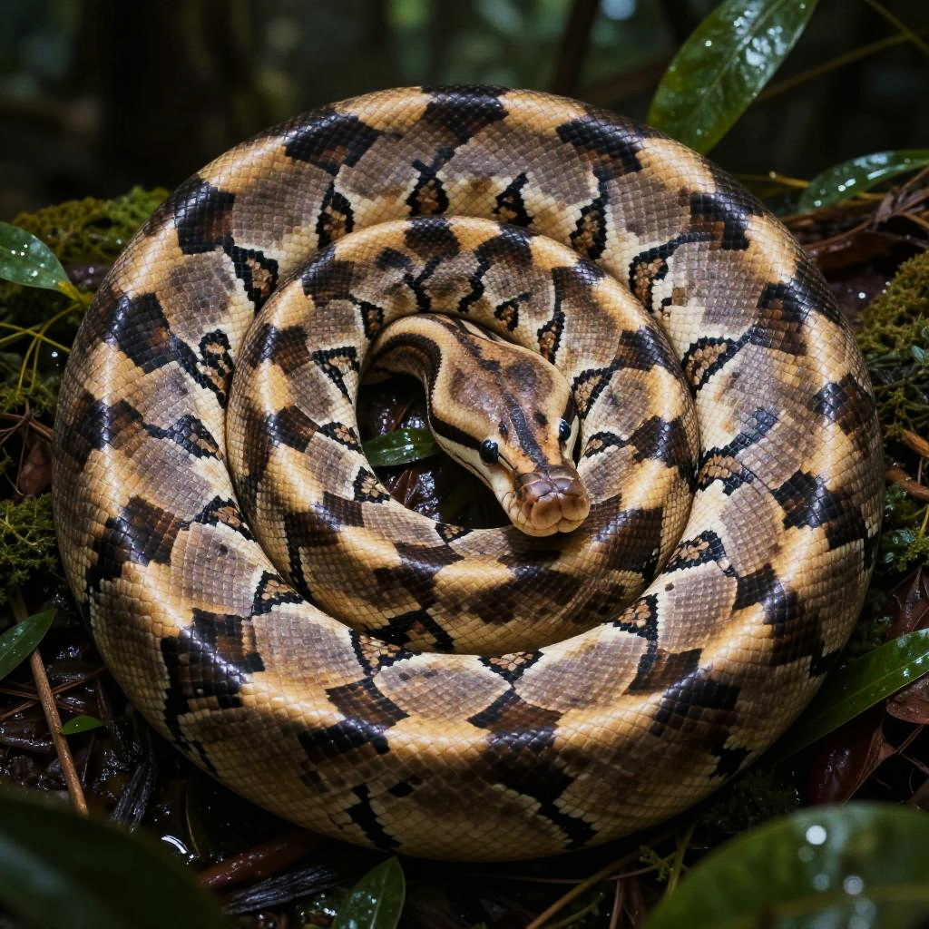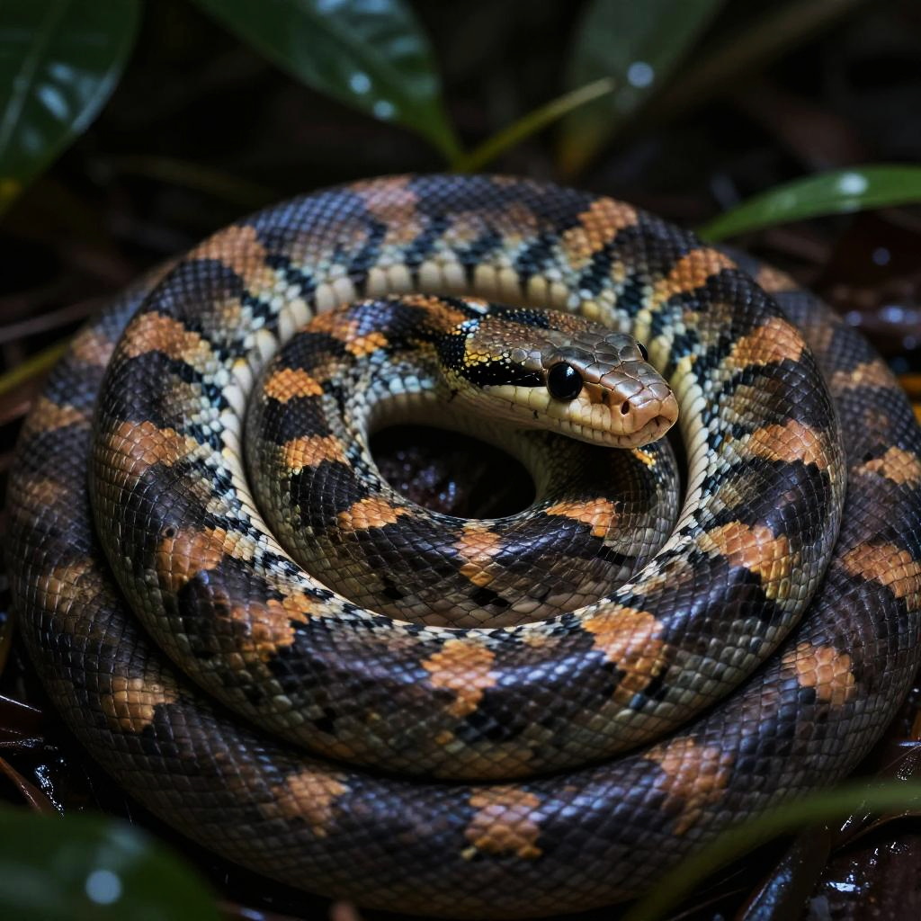 Close-up portrait of a rainbow boa coiled in a spiral in a lush jungle undergrowth, moody lighting, cinematic, vray render, cgsociety, artstation, 4k resolution