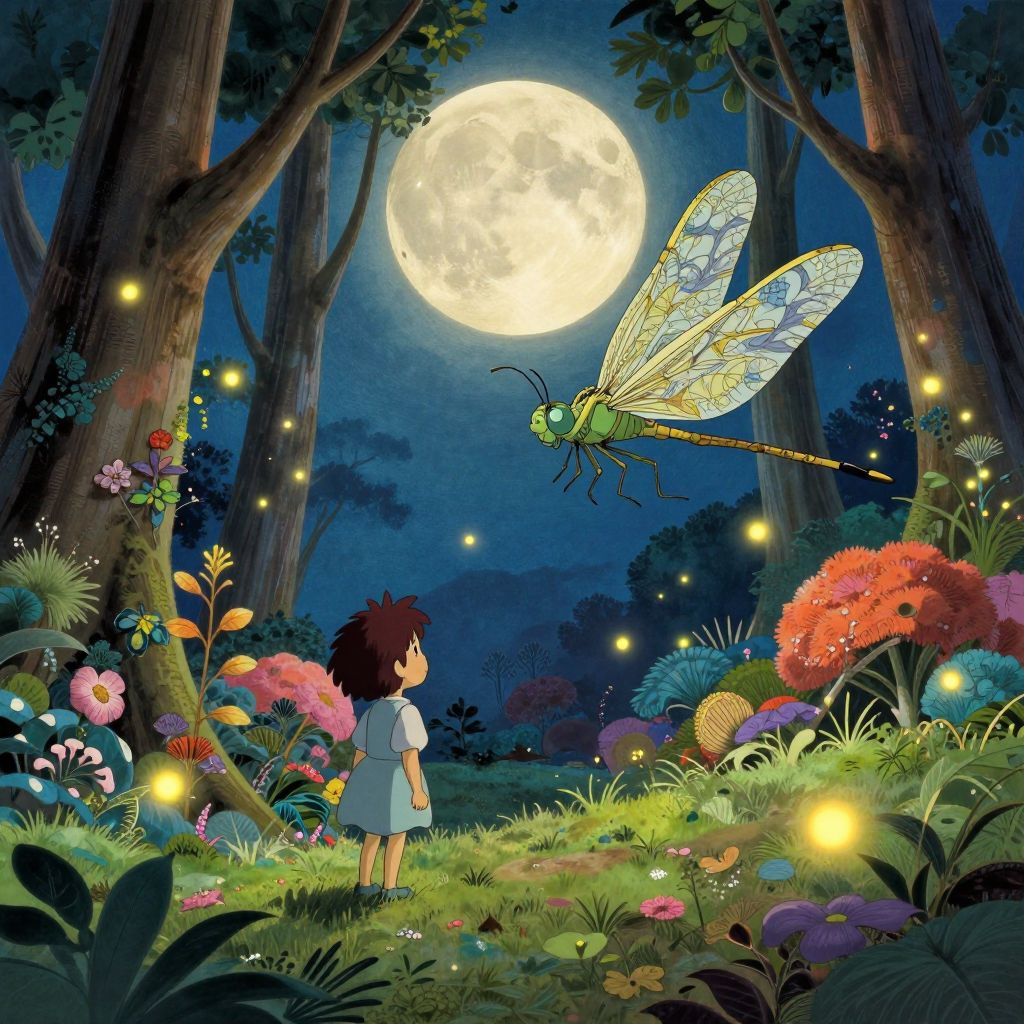 Envision an enchanting digital artwork that harmoniously blends the whimsical realms of Studio Ghibli with the dreamlike surrealism of Dalí, exquisitely rendered in vivid hues reminiscent of Japanese ukiyo-e woodblock prints. From a diminutive perspective, observe a minuscule dragonfly character, its wings adorned with intricate patterns, elegantly gliding through an otherworldly forest. A whimsical full moon, seemingly smiling benevolently, bathes the scene in its soft radiance, casting dappled light upon the radiant foliage and luminous fireflies that swirl enchantingly around the dragonfly. This evocative image captures a mesmerizing odyssey filled with magic, wonder, and enchantment.