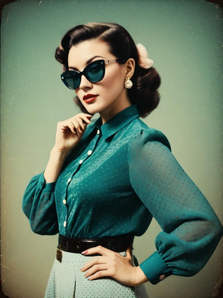 Woman, contemporary street style, sheer black blouse with oversized polka dots, button front, loose-fitting, balloon sleeves with fitted cuffs, glossy oxblood vinyl mini skirt with high waist, large angular sunglasses, side ponytail, peach-pink studio background. --sref 1387