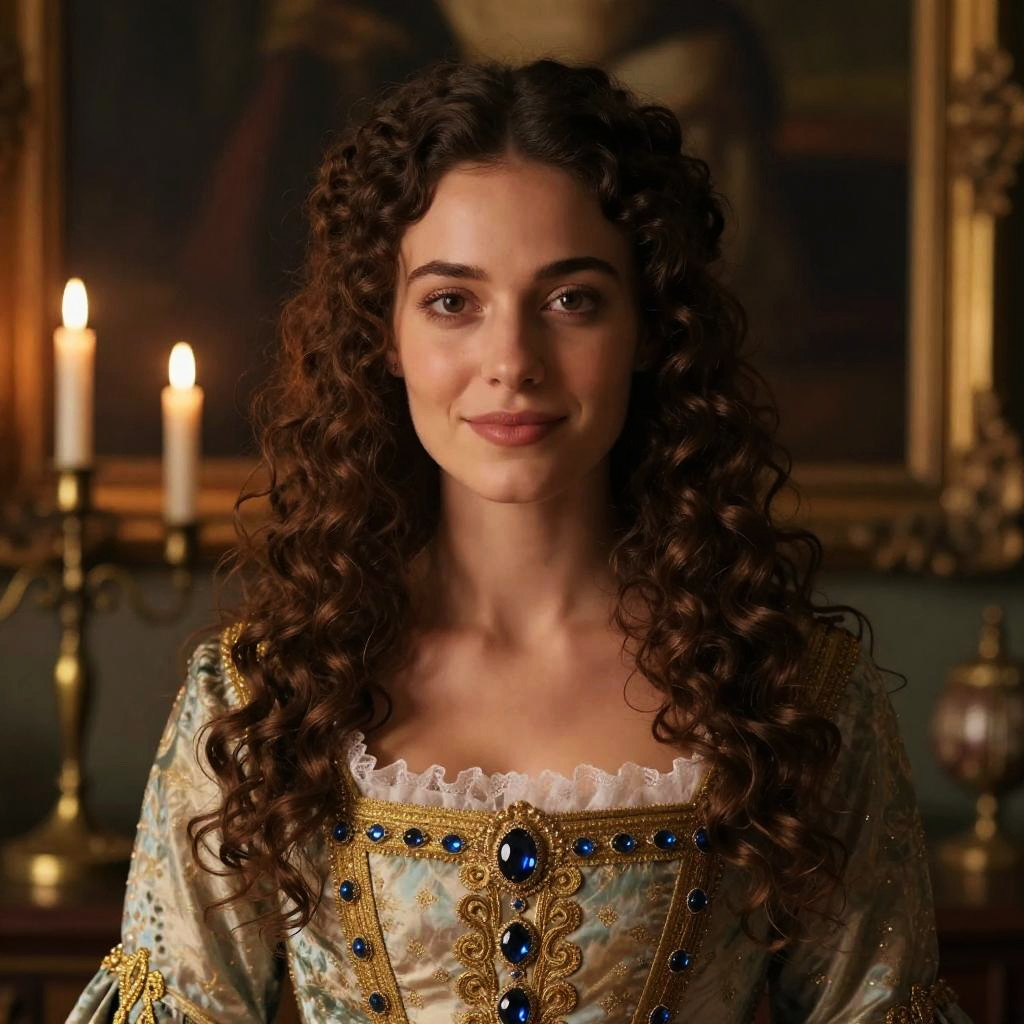 Photograph of a young woman with fair skin and dark, wavy hair styled in loose curls. She has brown eyes and wears a serious expression. She is dressed in an ornate, historical-style gown with a deep neckline, adorned with intricate gold embroidery and a small blue gemstone. She also wears a dark, sheer shawl over her shoulders and delicate, dangling earrings. The background is dimly lit, featuring blurred figures and a warm, yellow wall sconce, suggesting an 18th-century setting. The overall color palette is dark and muted, with rich browns and golds.