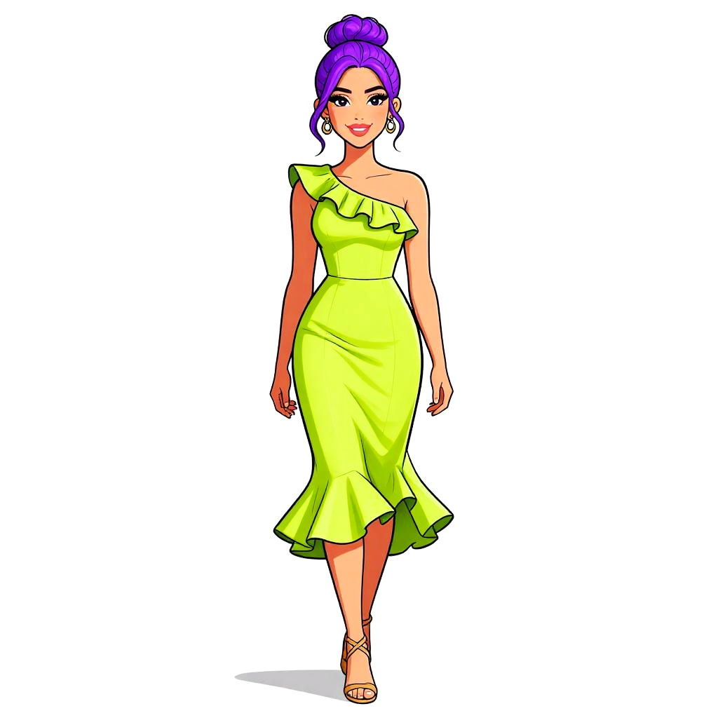 Digital illustration of a woman with vibrant purple hair, wearing an off-shoulder, light green, knee-length dress, and white sandals, walking forward