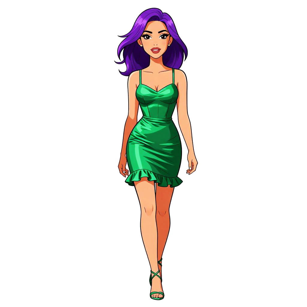 This is a digital illustration of a young woman with vibrant purple, wavy hair and fair skin. She has large, expressive eyes with purple eyeshadow and wears a light green, off-shoulder, knee-length dress that hugs her figure, accentuating her curves. She is walking towards the viewer, with a confident, relaxed posture. She wears white, open-toed heels and has a subtle smile on her face. The background is plain white, making the colorful subject stand out. The illustration style is reminiscent of modern, colorful comic art with bold lines and a slight dot texture on the dress.