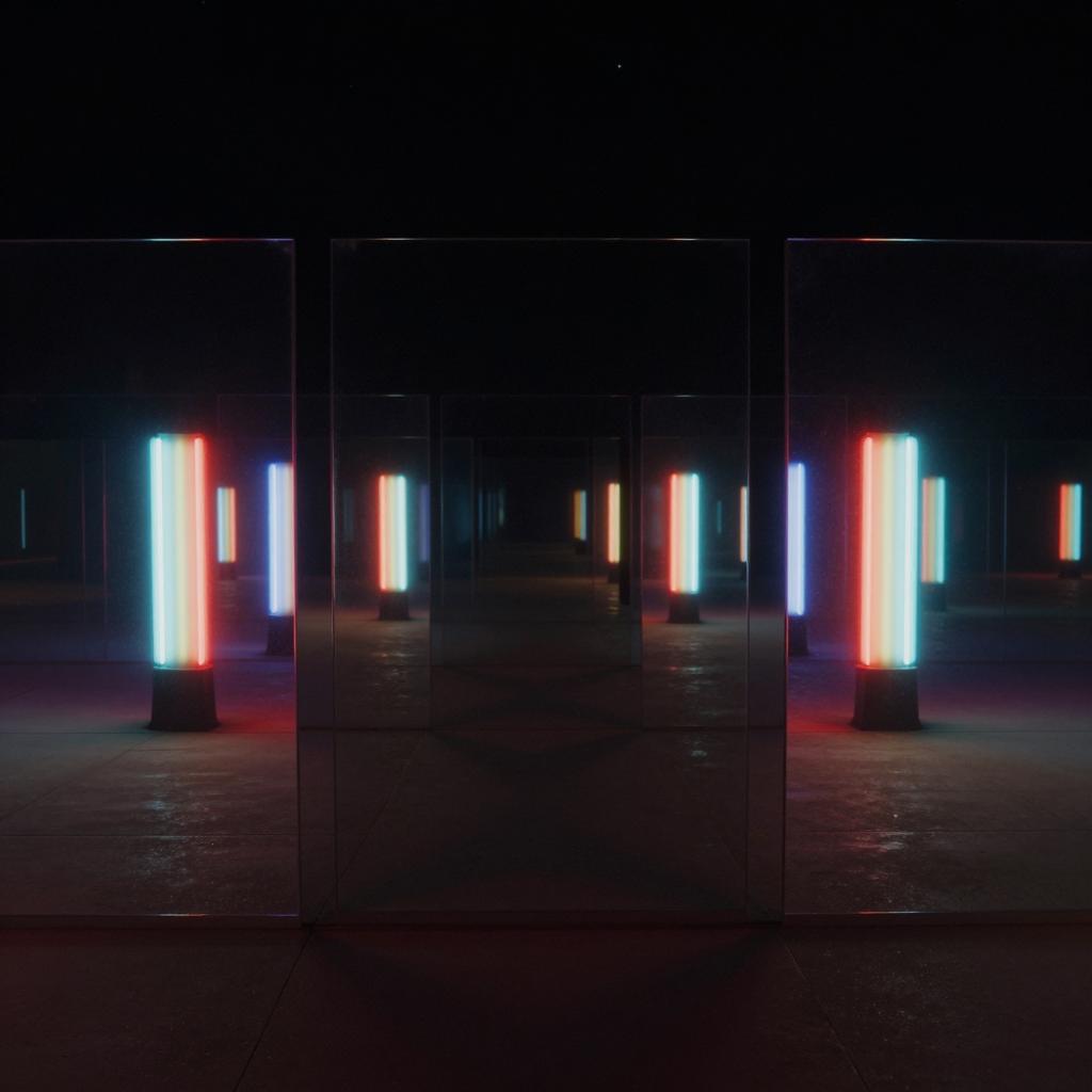 Abstract photograph featuring neon gas lights reflected multiple times in a series of mirrors, creating an optical illusion effect. The lights display vertical stripes in blue, red, and white hues against a dark background with a hint of outer space and distant stars.