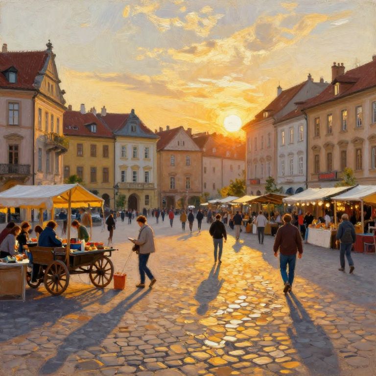 Photograph of a bustling European town square at sunset, with colorful buildings, street vendors, cobblestone pavement, and people walking. Warm orange sky