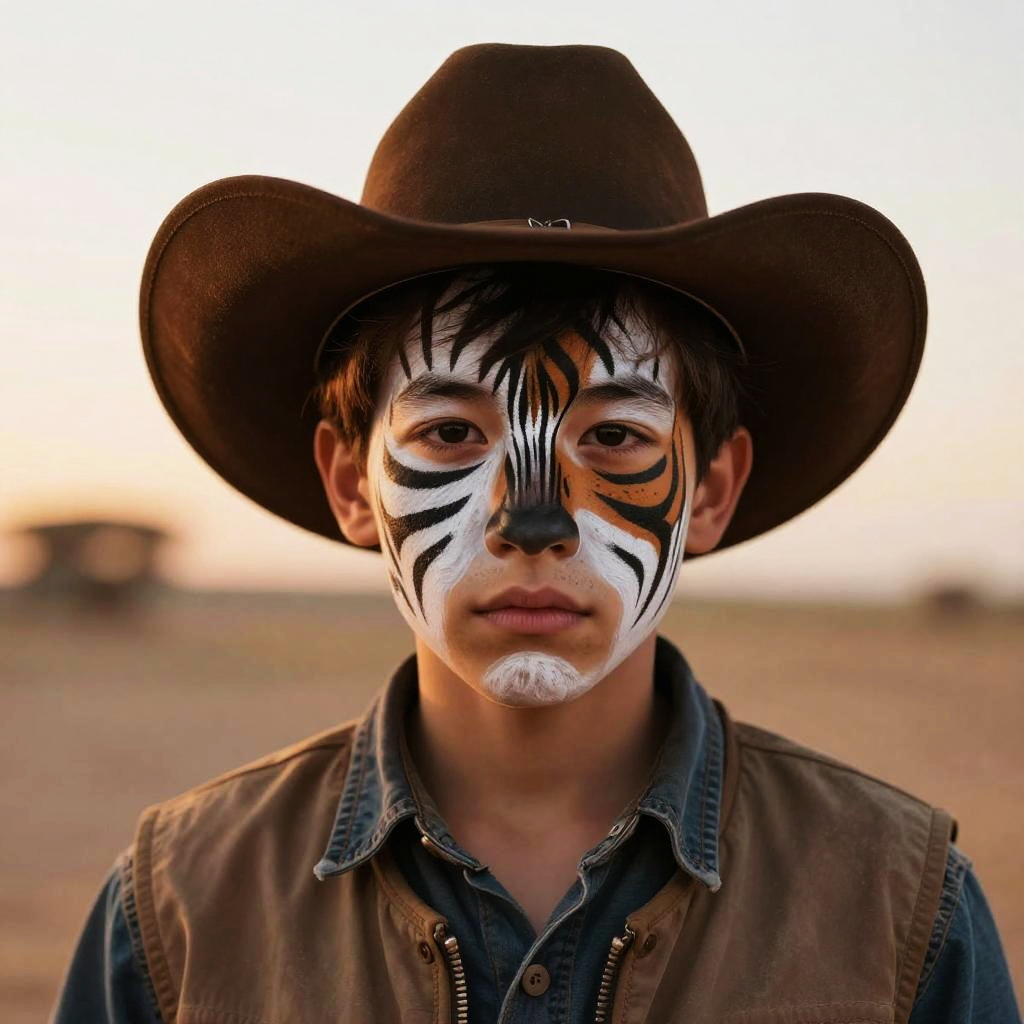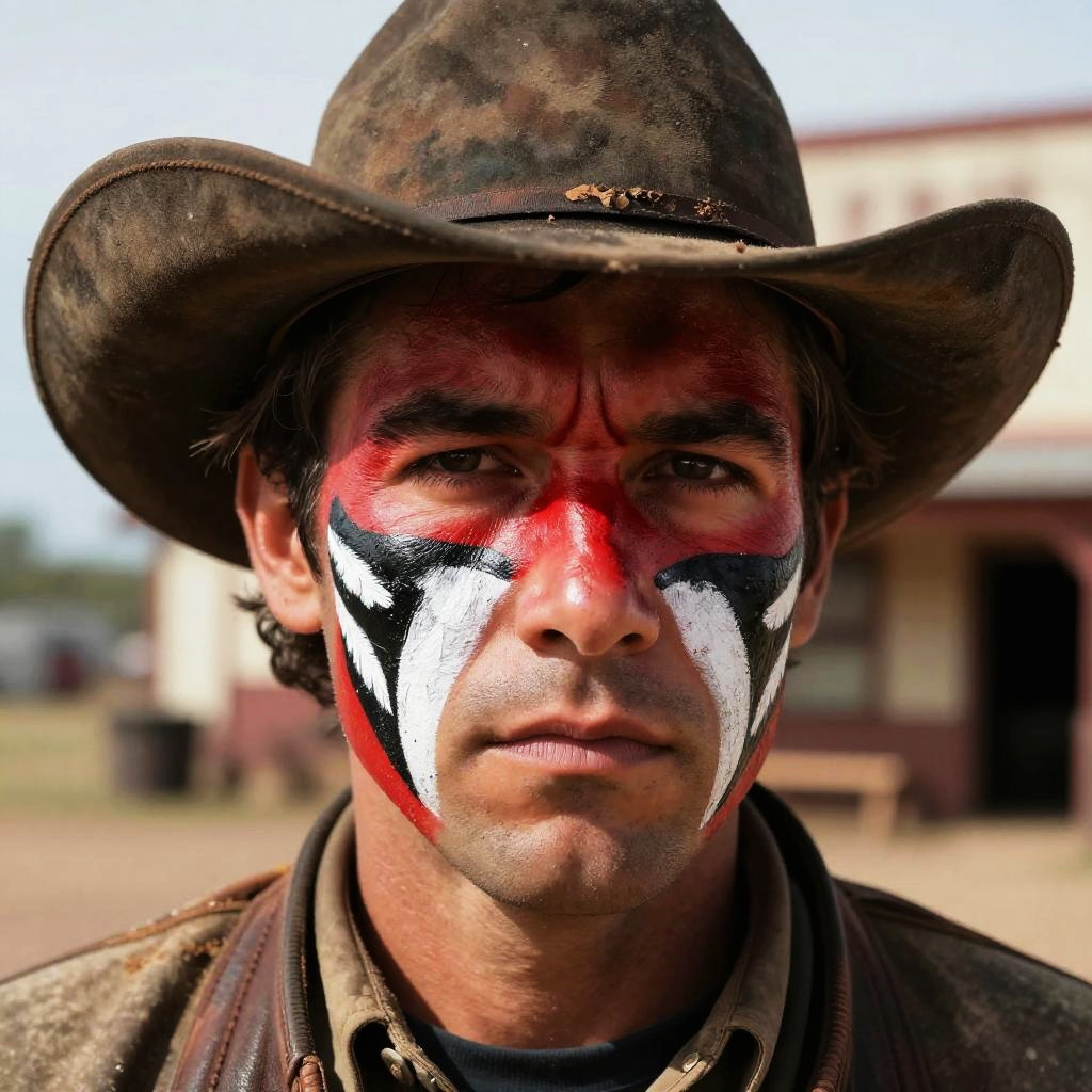 Close-up portrait of a cowboy face paint design featuring bold red, black, and white strokes that mimic traditional Native American war paint, worn by a stern man with a weathered hat, dusty background with a vintage saloon, realistic style with intense shadows.