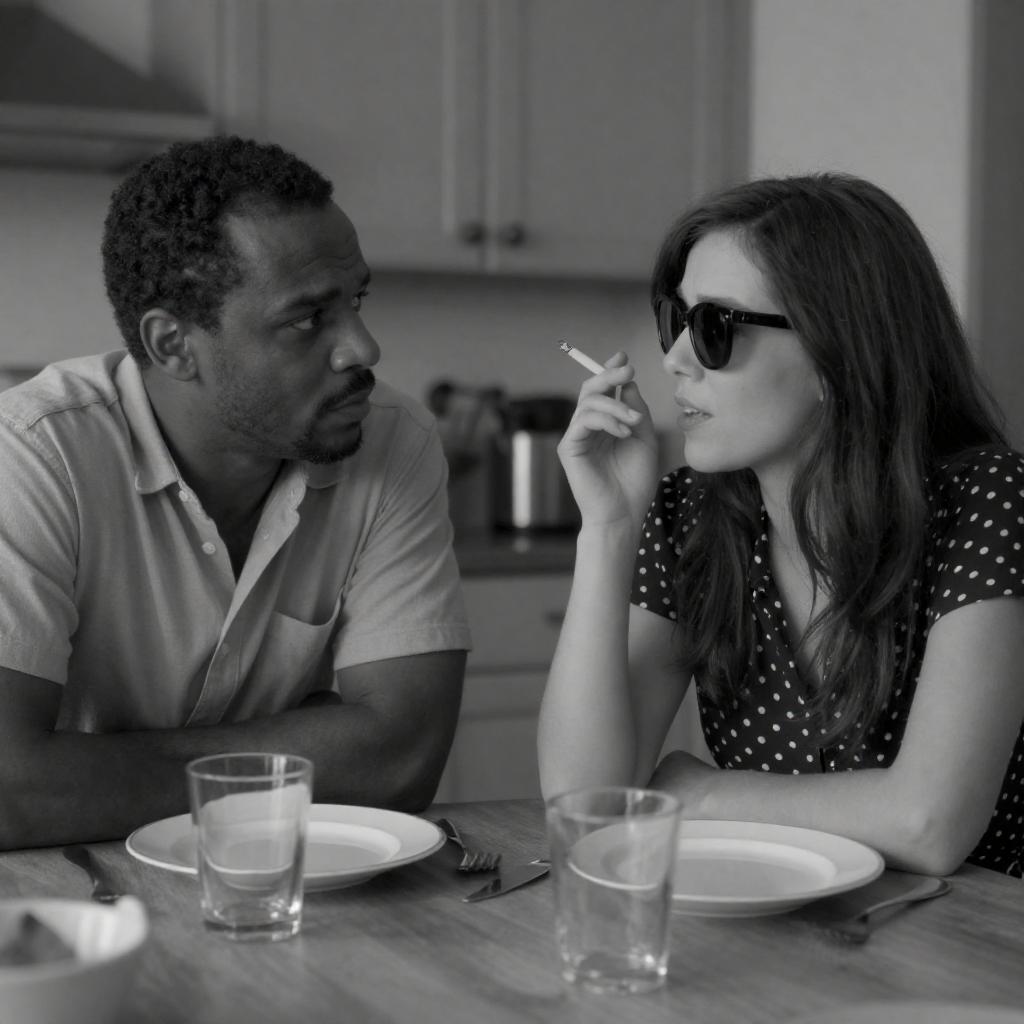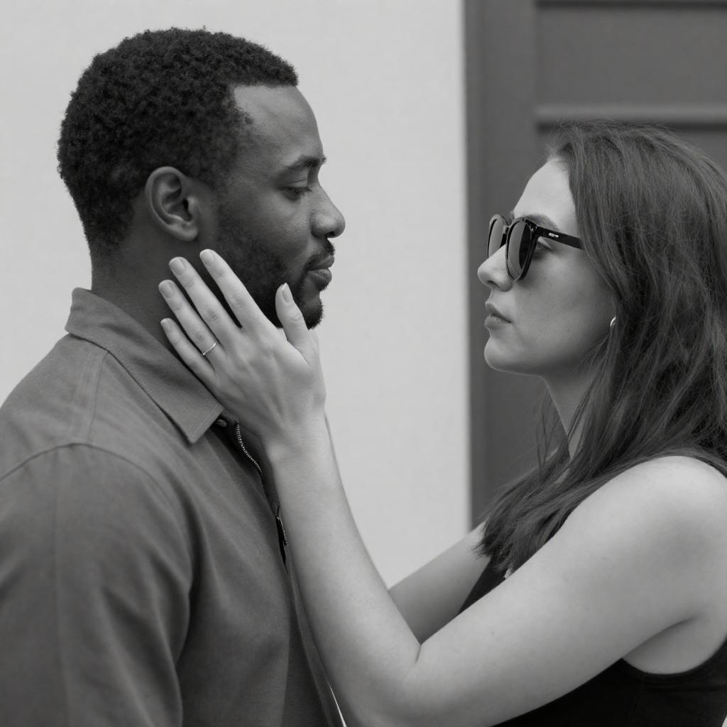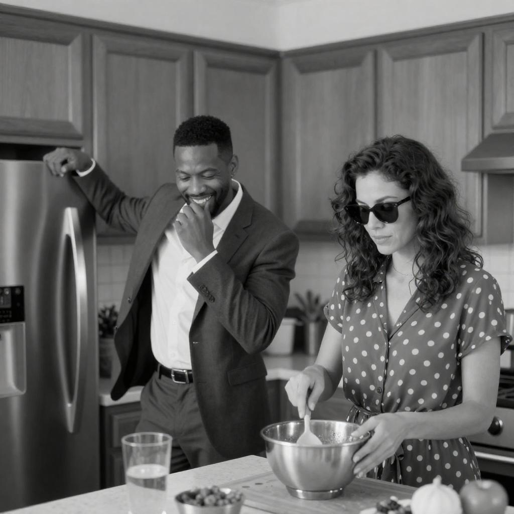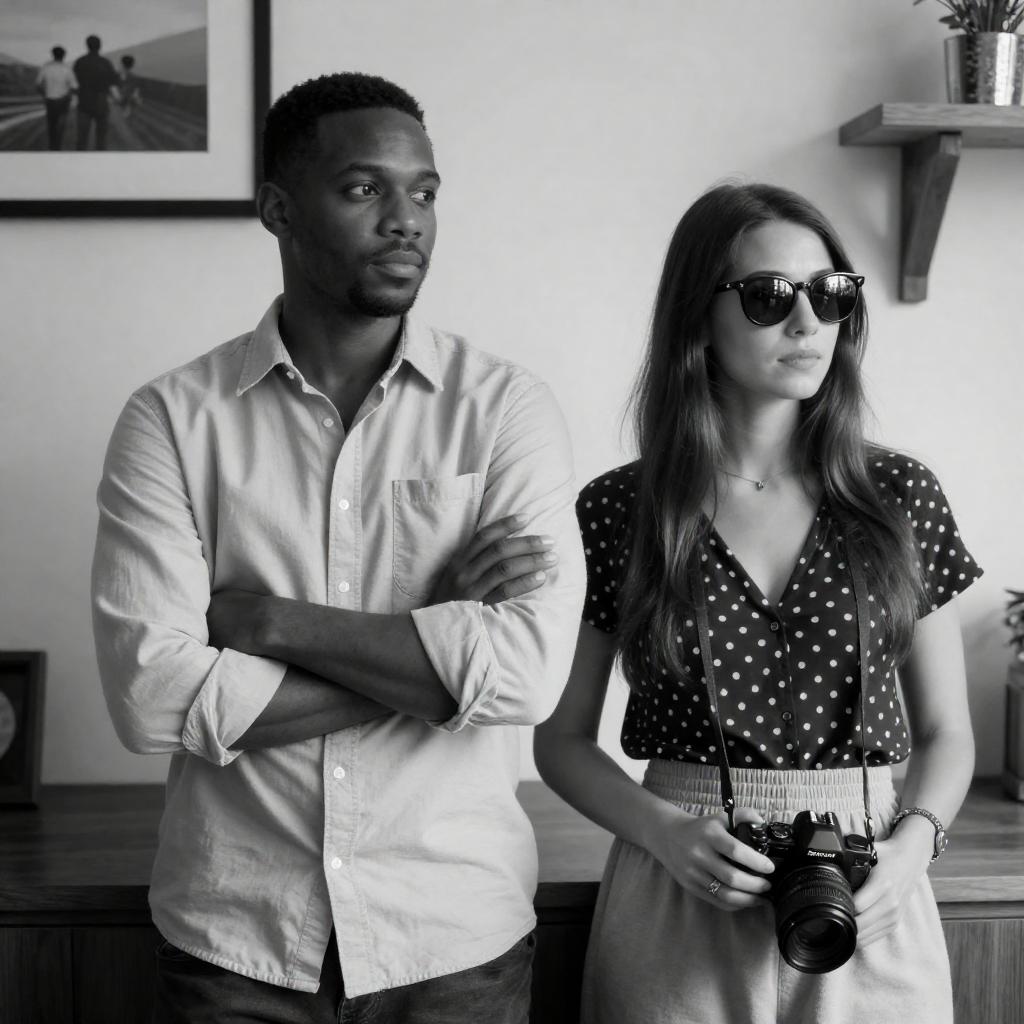 Black and white photograph of a black man and a white woman. Man with short hair, crossed arms, light shirt, dark pants. Woman with long hair, sunglasses, polka dot top, light skirt, holding camera. Man looks right, woman looks left. Background includes framed picture and wooden shelf. Light and shadows create contrast. Man in left foreground, woman in right midground.