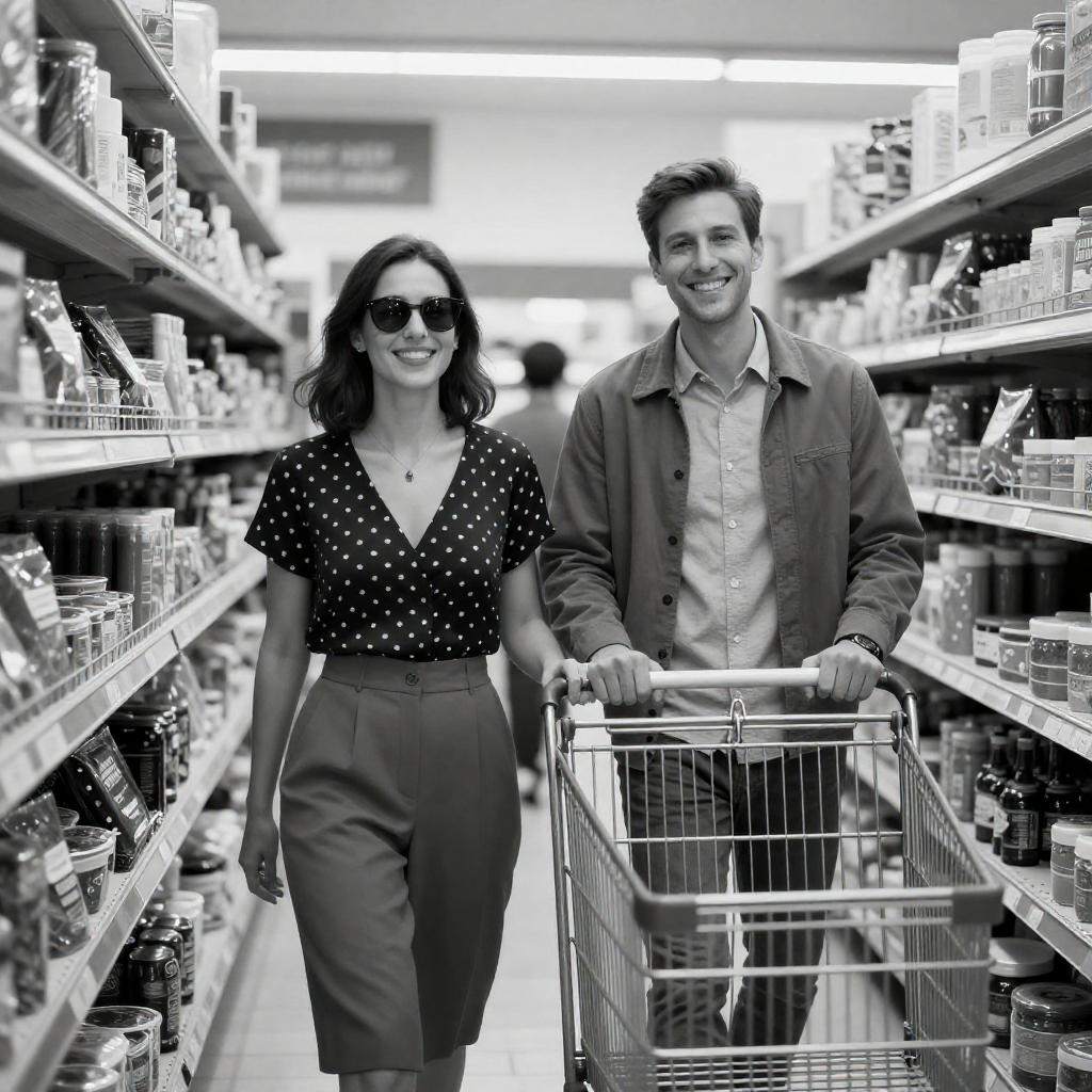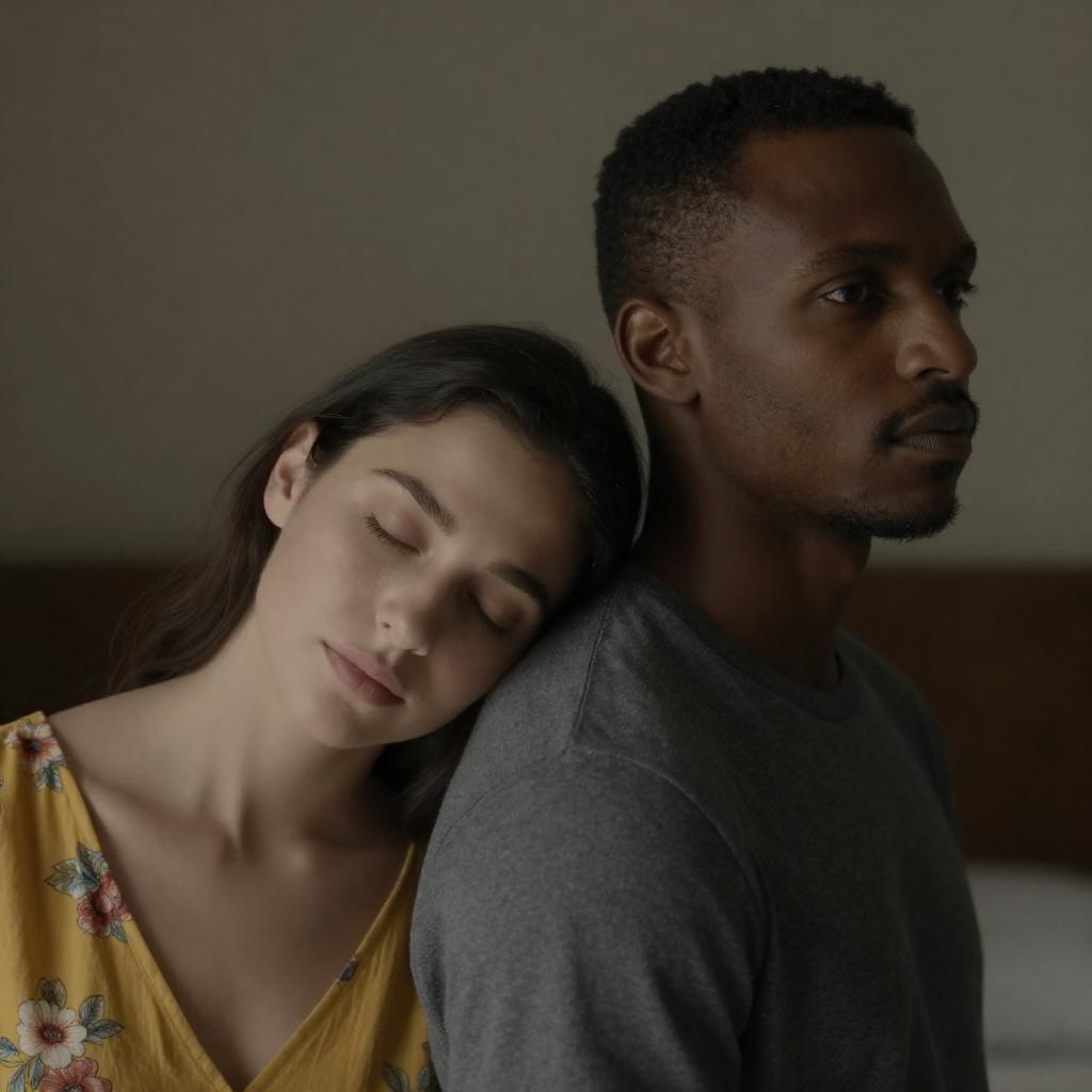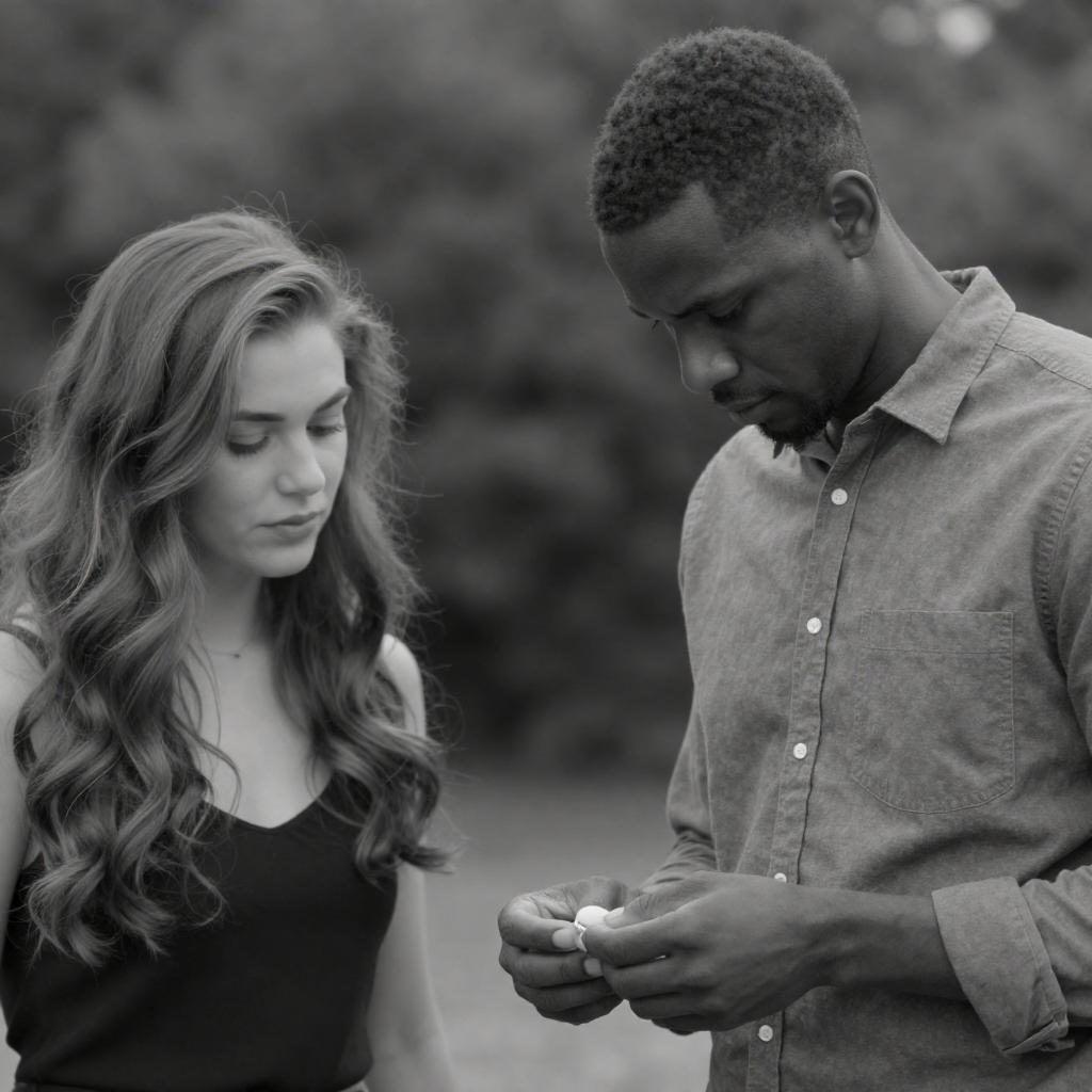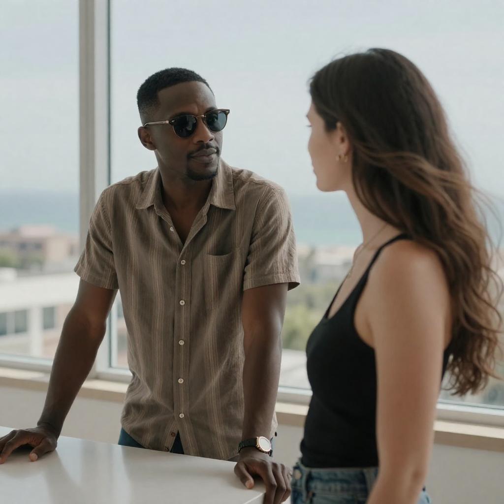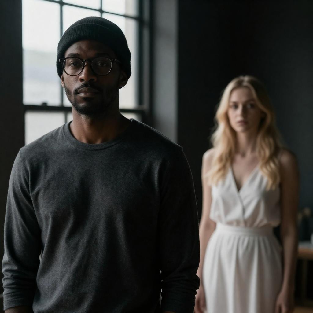 Black and white photograph of a black man and a white woman. Man with short hair, crossed arms, light shirt, dark pants. Woman with long hair, sunglasses, polka dot top, light skirt, holding camera. Man looks right, woman looks left. Background includes framed picture and wooden shelf. Light and shadows create contrast. Man in left foreground, woman in right midground.