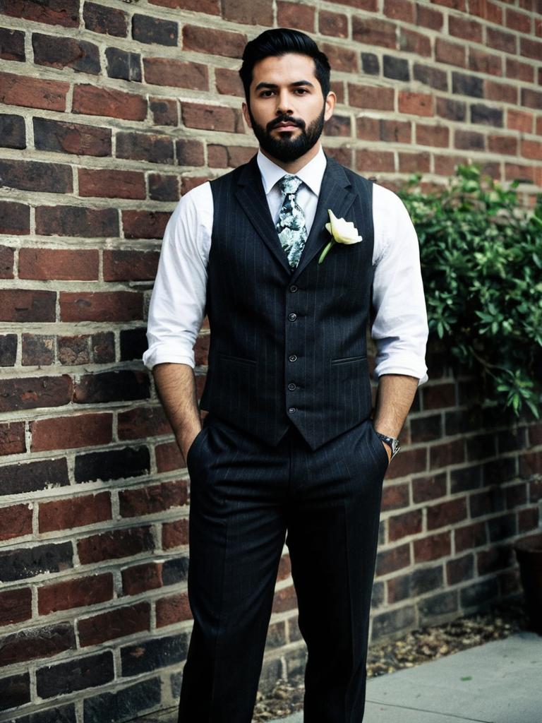 Portrait of a young man with black hair and beard wearing a black pinstripe vest and pants, white rolled-up shirt, floral necktie, and a white flower boutonniere standing against a brick wall with hands in pockets. The man looks directly at the camera in a confident pose. The background includes a green shrub.