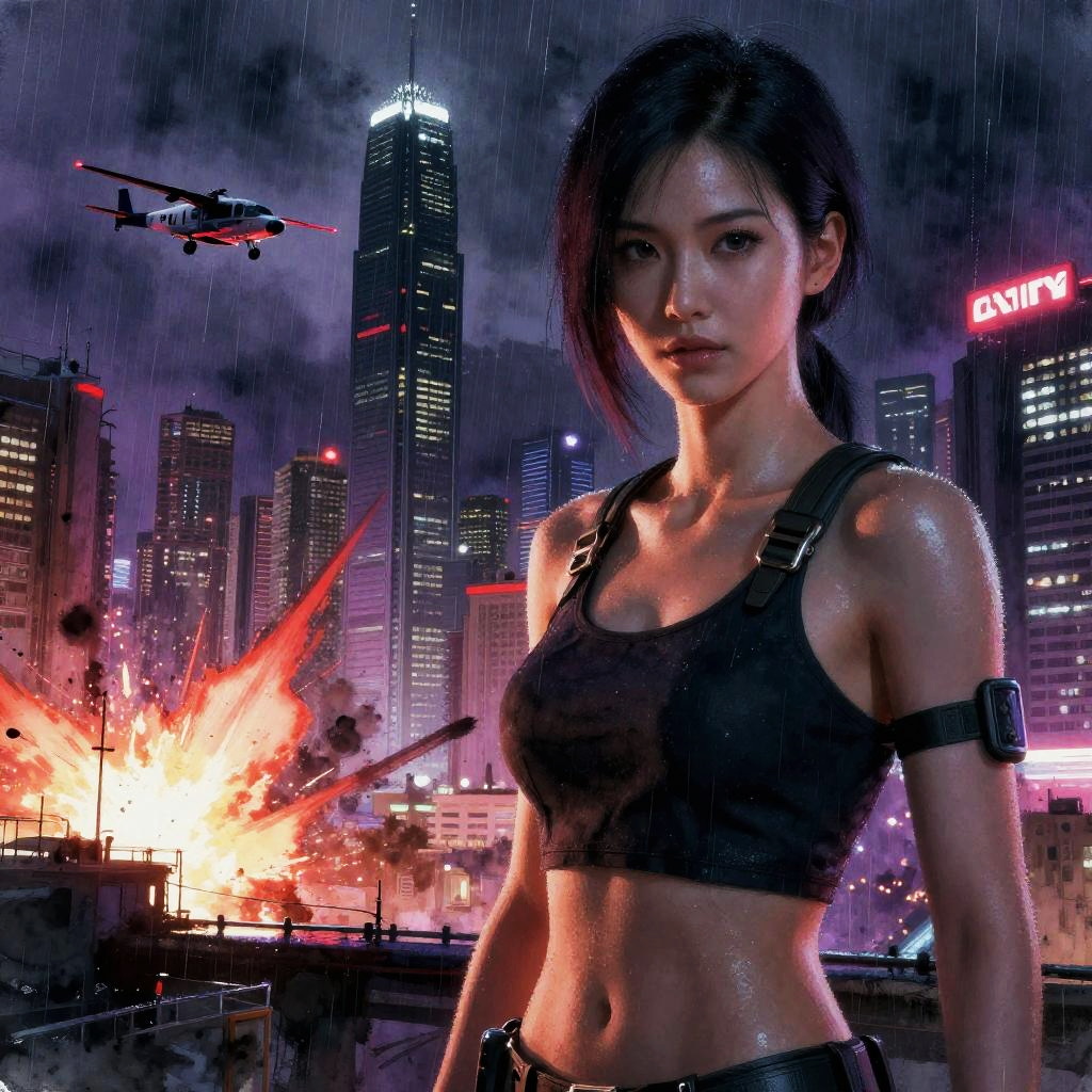Photorealistic image of a fit Asian woman with glowing skin standing in a rain-soaked cyberpunk city at night. She wears a black tactical crop top with straps and an arm device, set against a backdrop of neon-lit skyscrapers and towering futuristic buildings inspired by Kowloon Walled City. A police aircraft flies overhead while an intense explosion lights up the lower city area, adding dramatic cinematic and watercolor brush stroke effects to the scene.