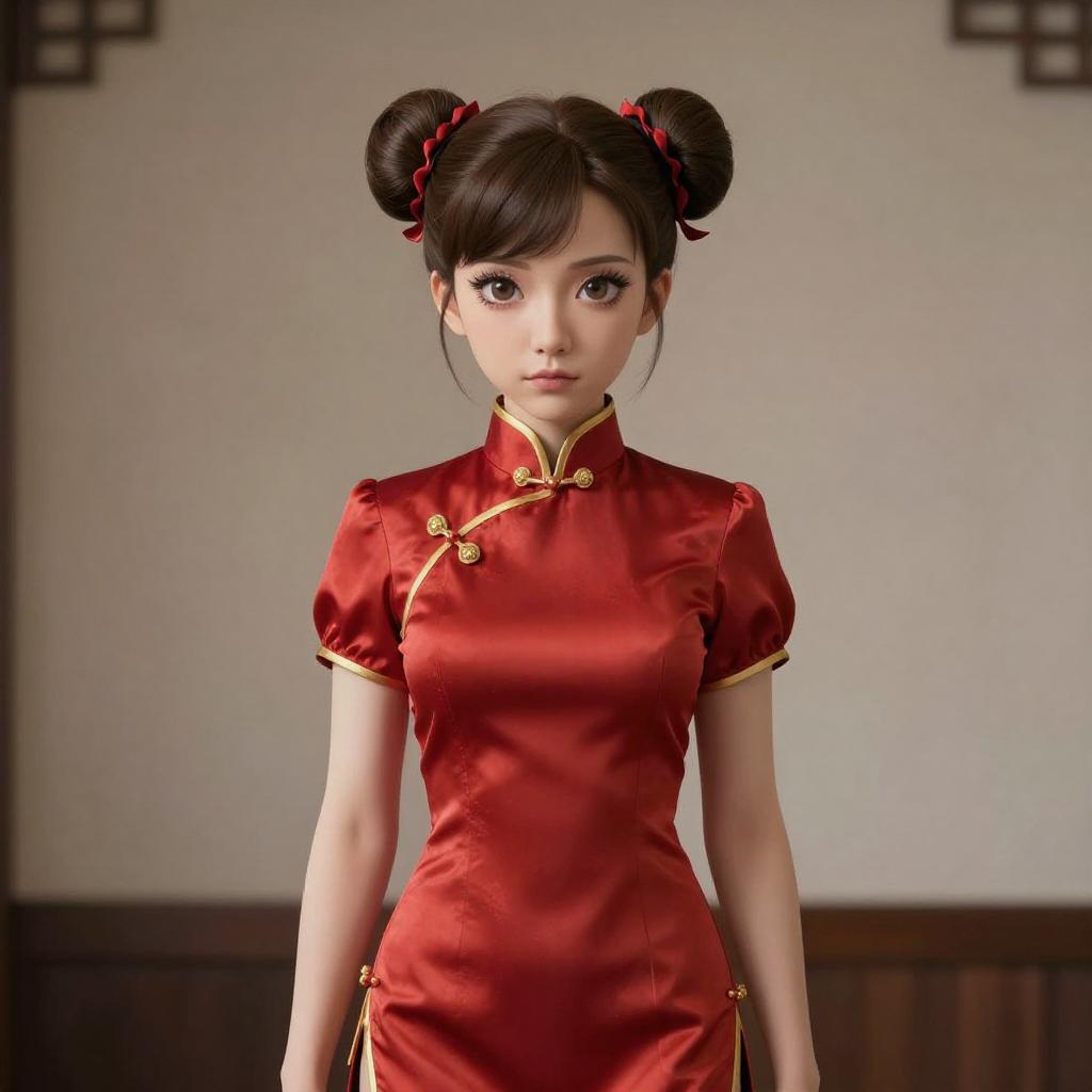 1girl, chun-li, hades-8500, cartoon, brown hair, brown eyes, ((((red dress)))), portrait, closed mouth, looking at viewer, ((chinese dress)), gothic, double bun, ((realistic)), short hair, solo, soft lighting, shading