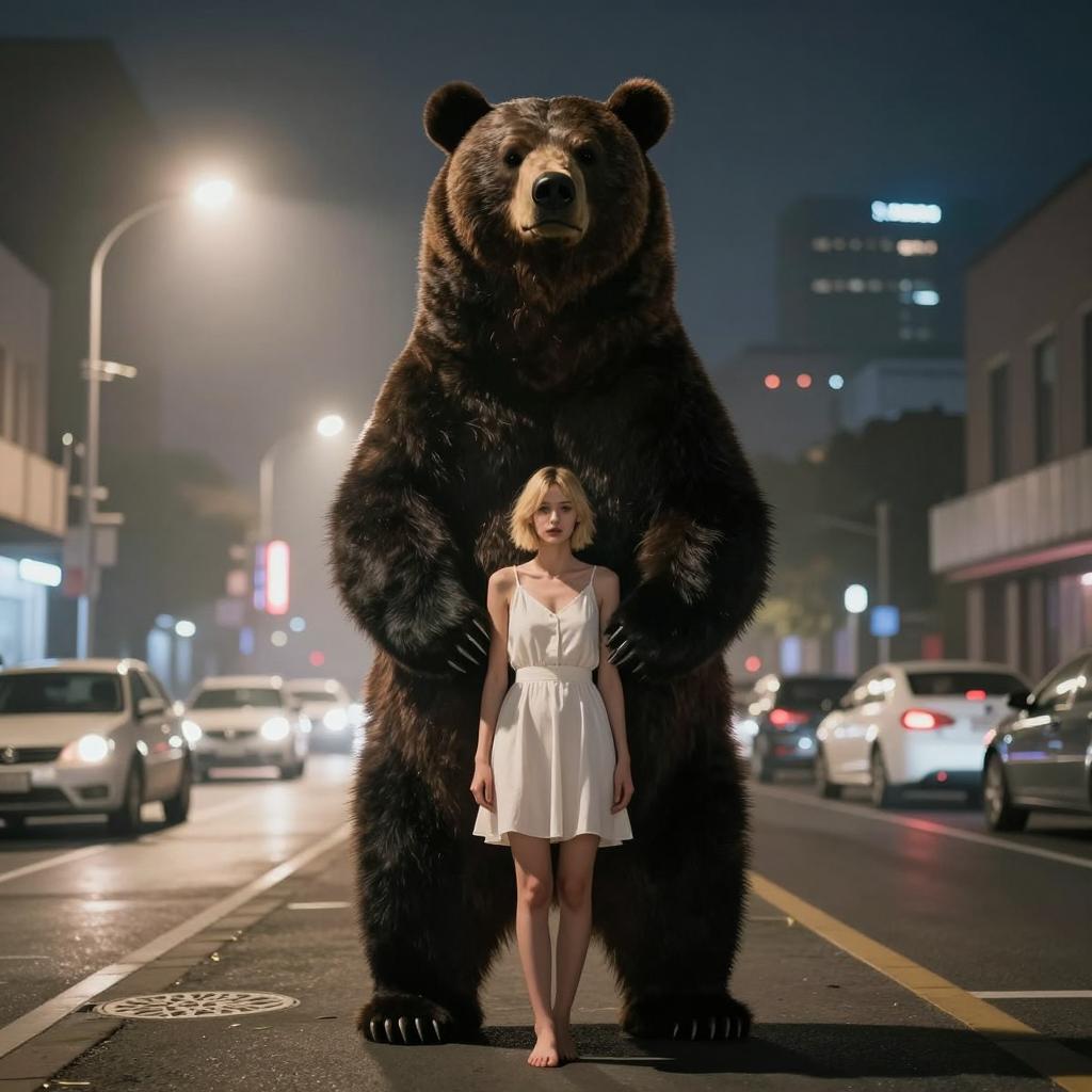 A surreal image featuring a face swap of Baloo the bear from Jungle Book with a young woman standing together in a dense forest. Baloo has a large bear body with a human female face, and the woman is wearing a grey sports bra and blue pants, standing confidently amongst lush green foliage.