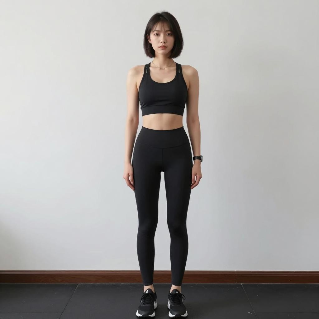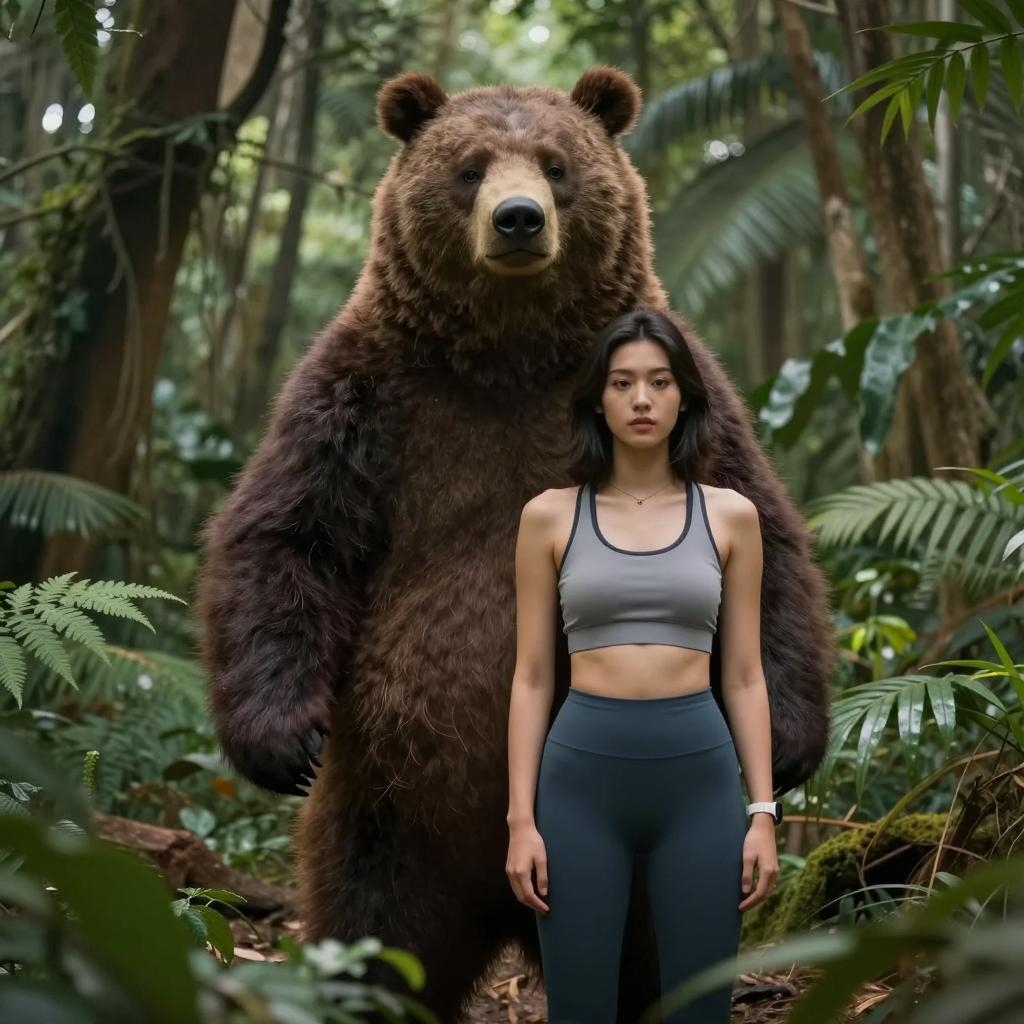 A surreal face swap image featuring a large brown bear with a human female face standing behind a young Asian woman wearing a grey sports bra and blue leggings. The duo is in a dense, lush green forest with tall trees and tropical plants.