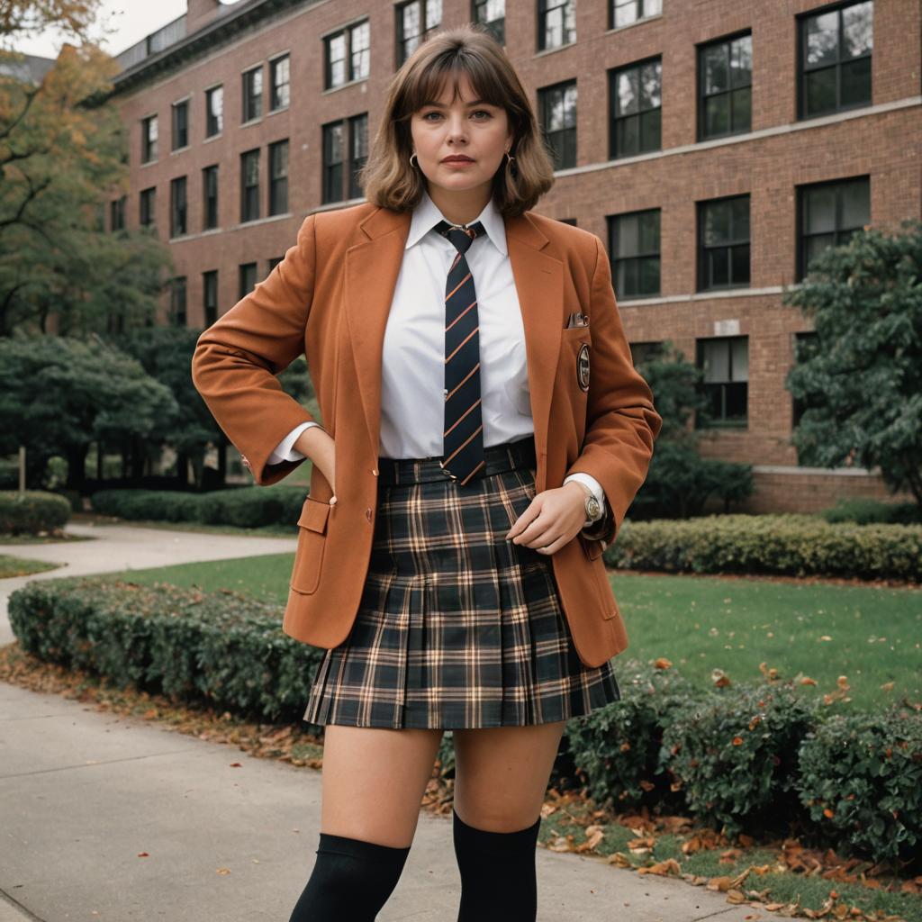 Portrait of a young woman wearing a copper heavy cotton blazer with crest emblem, white shirt, black and orange plaid tie, green plaid pleated skirt, and knee-high socks. She stands confidently outdoors in front of a large brick building, likely a library or school. The outfit reflects an early 2000s preppy school style with a rebellious edge.