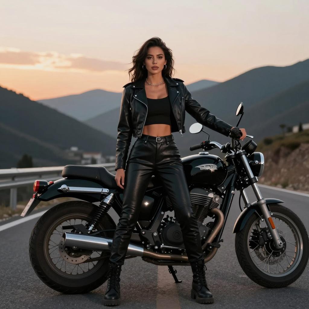 A confident woman dressed in a sleek black leather outfit stands beside a classic black motorcycle on an open road at sunset. The dramatic mountainous landscape in the background complements the edgy, modern style of the scene, capturing a sense of freedom and adventure.