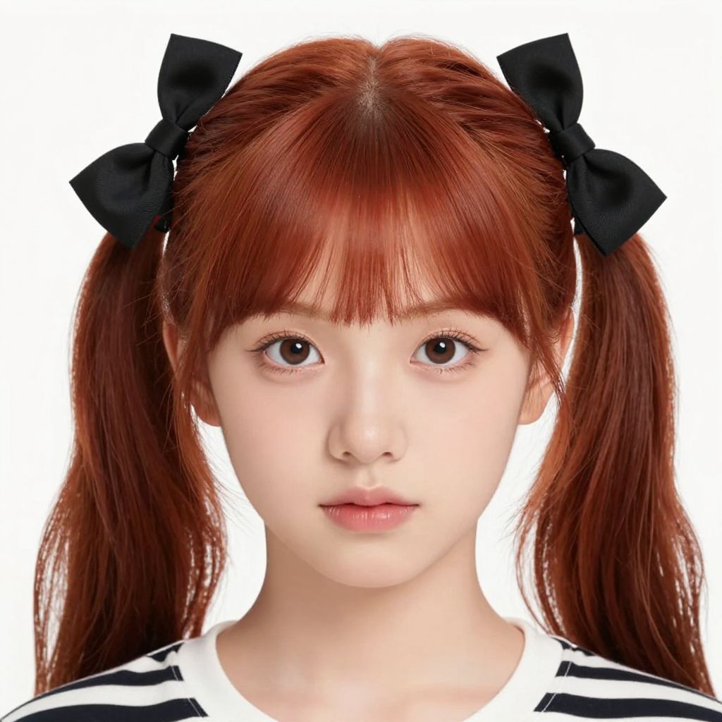 Photograph of an East Asian young woman with fair skin and large, dark brown eyes. She has long, straight, auburn hair styled in two high pigtails, each secured with a large black bow. Her hair has straight bangs that cover her eyebrows. She wears a black and white striped shirt. The background is pure white, making her the focal point. Her expression is neutral, with slightly parted pink lips. The image has a realistic, high-definition style, emphasizing her youthful and delicate features.