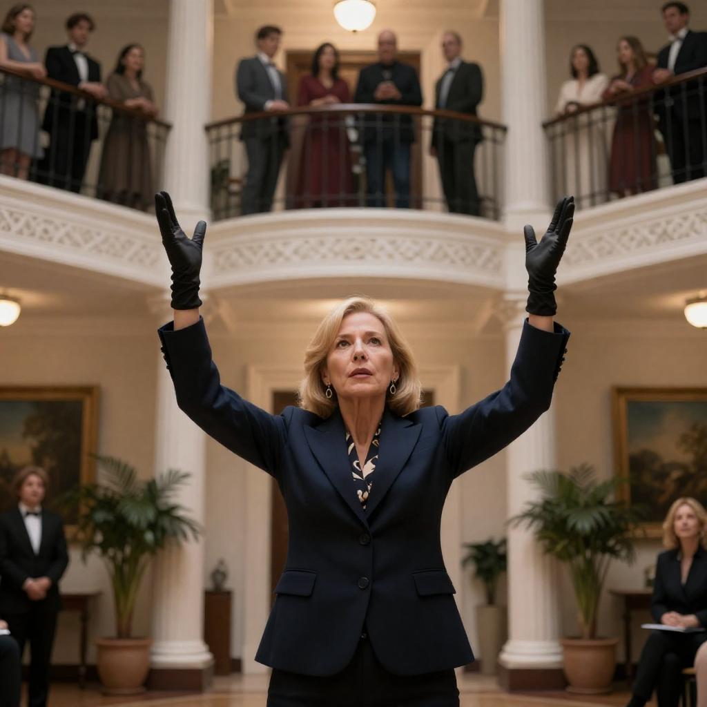 Blonde woman in white suit with red top, holding pink folder, walks down red carpeted aisle. Wooden pews on both sides, people seated, some looking at her. Background: wooden walls, golden accents. Woman smiles, confident. Men and women in formal attire, varied expressions. Dim lighting.