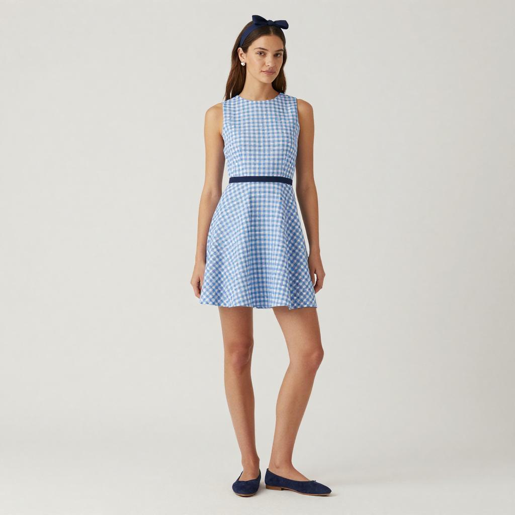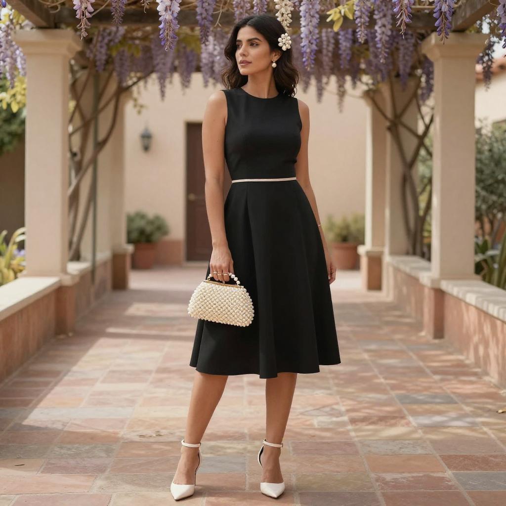Woman, contemporary chic, black cocktail dress, high round neckline, cropped overlay bodice, flared skirt, above the knee, thin waistband, ivory scalloped ankle-strap kitten heels, mother-of-pearl cluster hairpin, thin stackable gold midi rings and a petite pearl-beaded clutch, sun-dappled wisteria-covered pergola in a secluded courtyard with terracotta pavers and soft afternoon light.