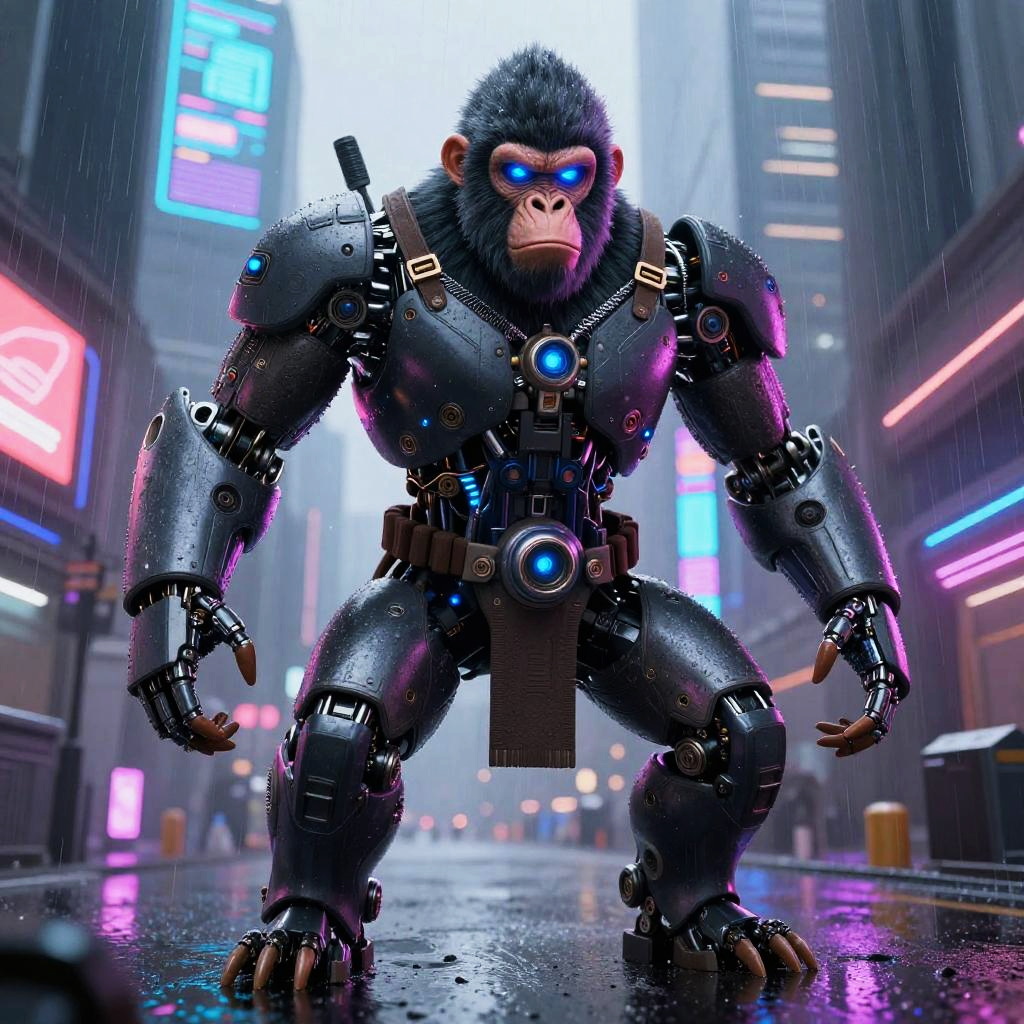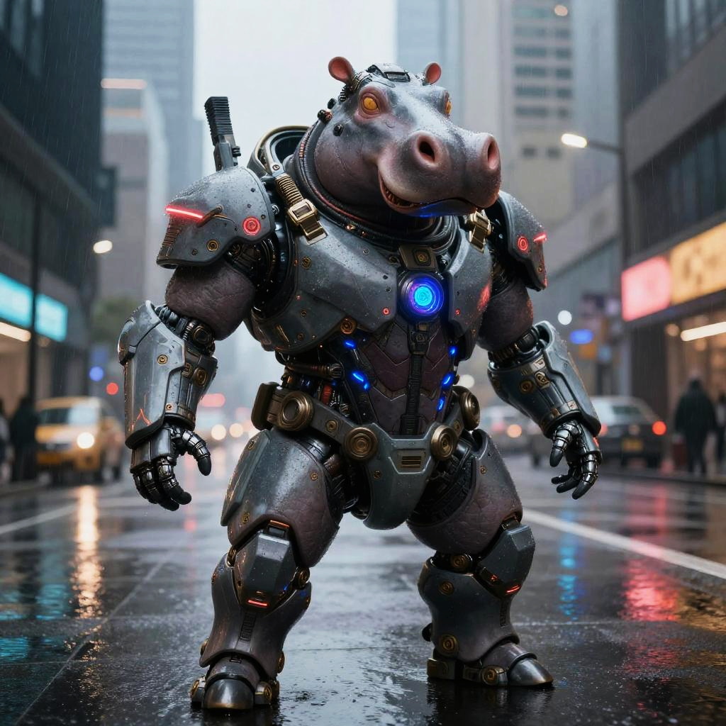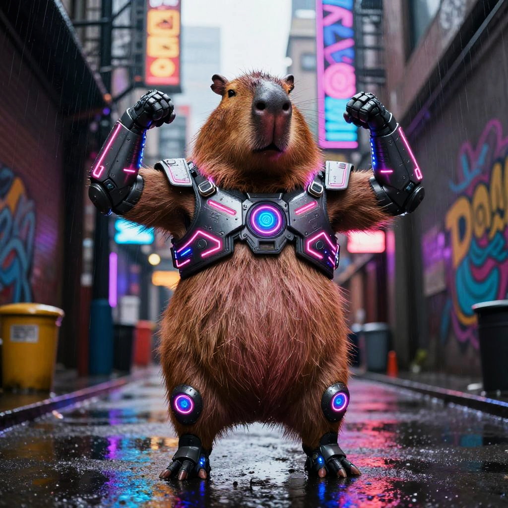 Gigachad capybara flexing muscles, glowing neon cyberpunk armor, amidst a rain-soaked urban alley filled with holographic graffiti, intense colors and high detail