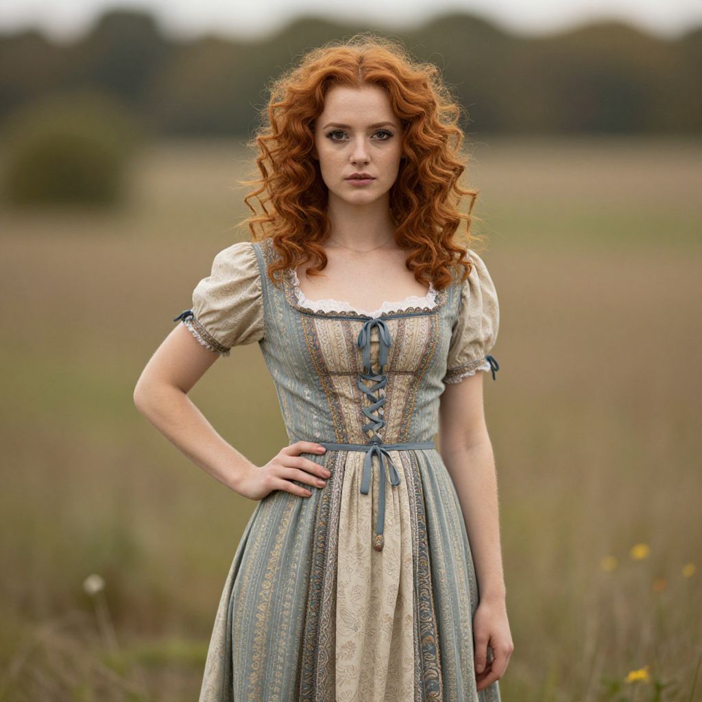 A young woman with striking curly red hair stands in a serene field, exuding confidence. Dressed in an elegant vintage-style dress with intricate details, she captivates the viewer against a beautiful natural backdrop, showcasing a blend of classic fashion and contemporary portraiture.