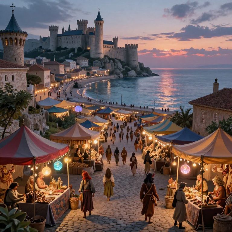 Fantasy port city art depicting a vibrant market by the sea with cobblestone streets, colorful tents, exotic goods, and mythical beings trading under glowing magical orbs, with a backdrop of majestic castles and shimmering water reflecting the twilight sky.