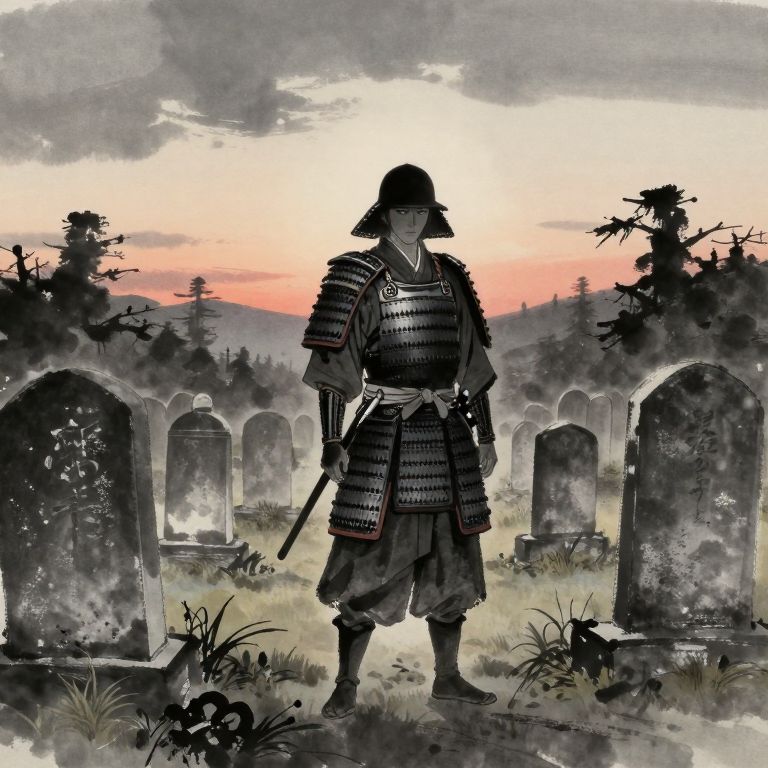 Digital painting of a samurai in full armor standing in a misty graveyard at sunset, holding a sword, with tombstones in the background.