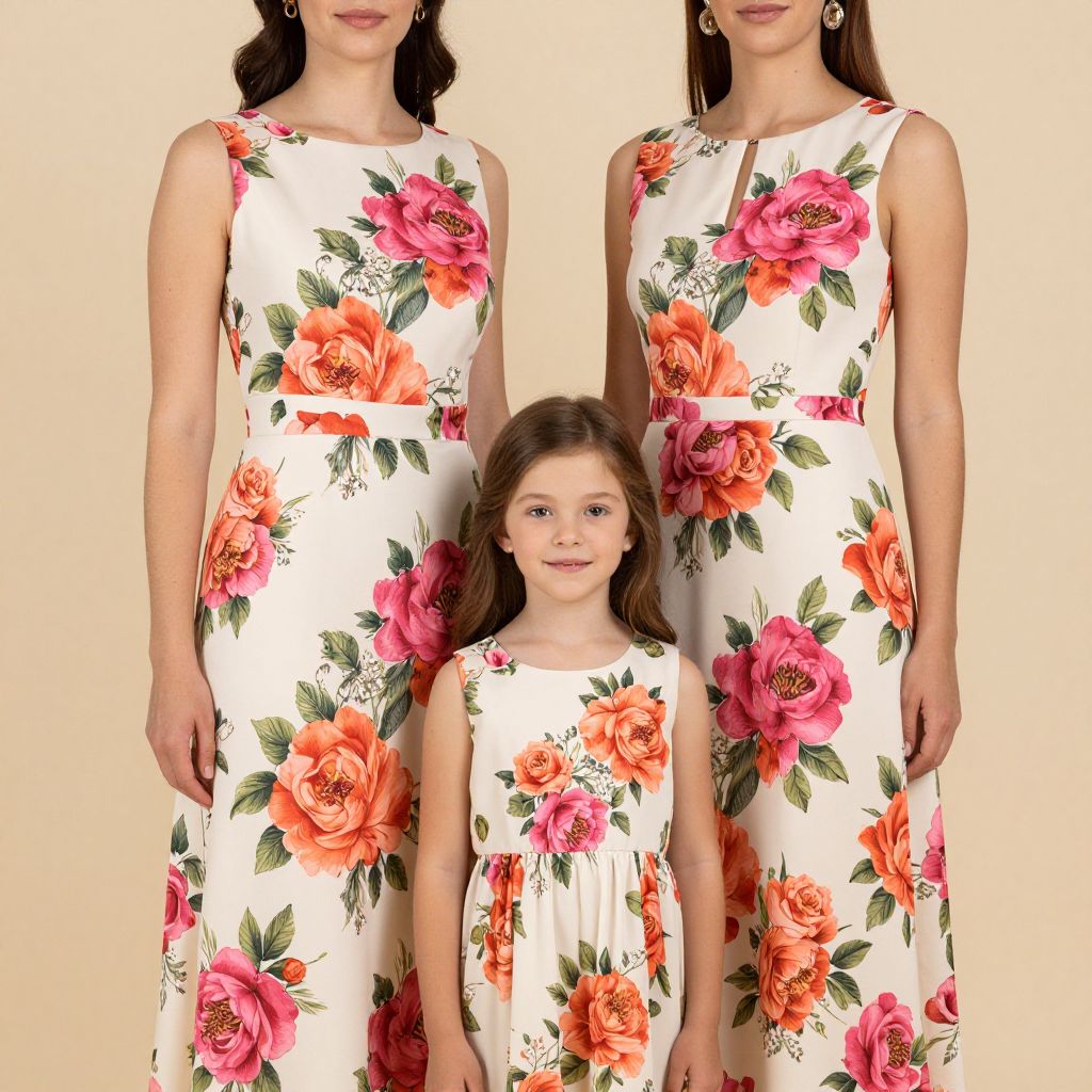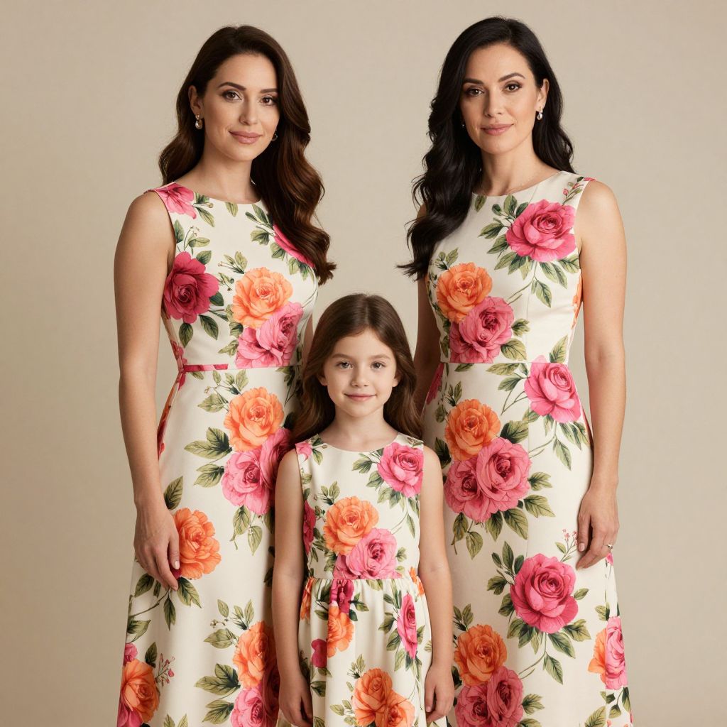 Two individuals, a woman and a young girl, stand side by side wearing elegant, matching sleeveless floral-print dresses featuring vibrant pink and orange roses against a cream background, symbolizing a harmonious mother-daughter ensemble suitable for special occasions.