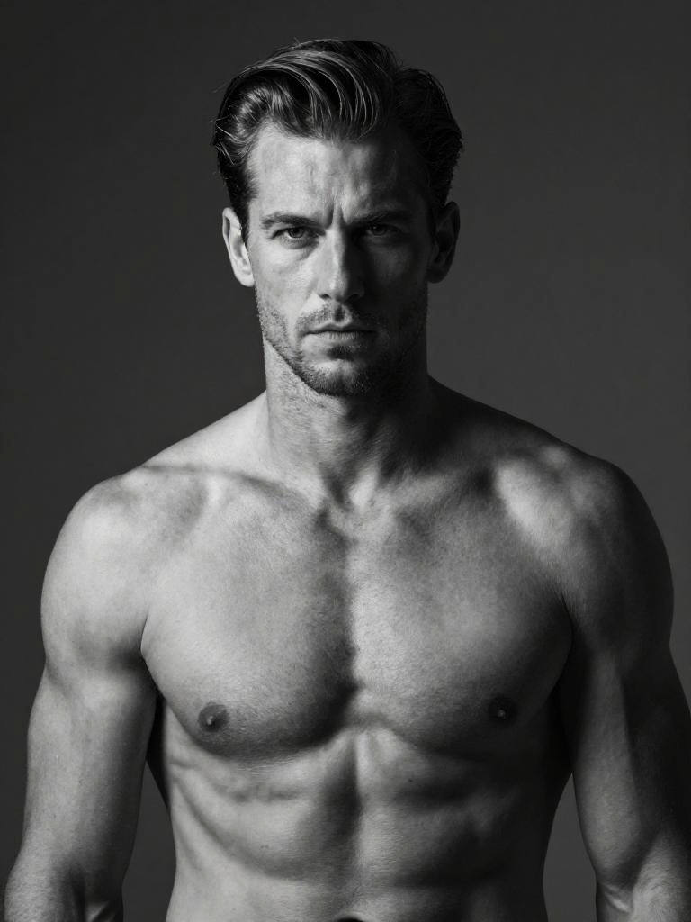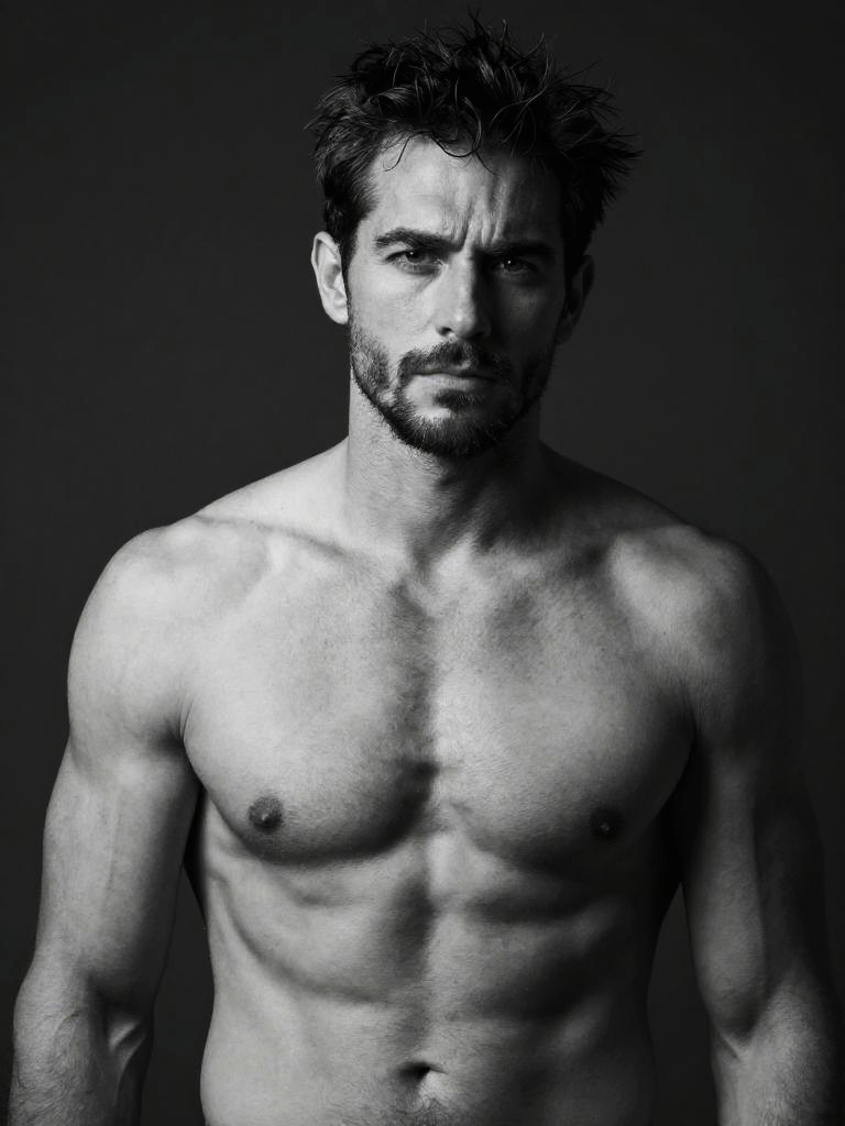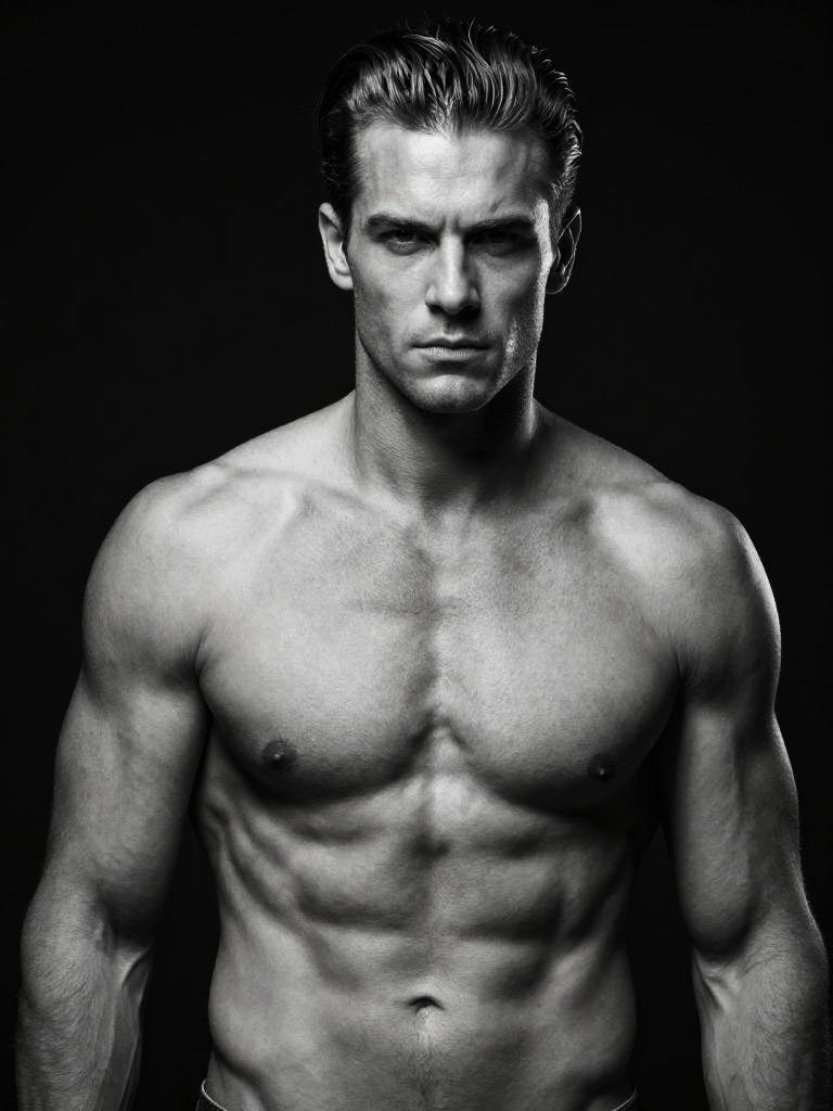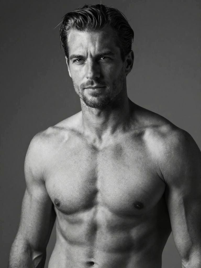 Shirtless male fitness model portrait, early 30s man, slicked-back brown hair, lean defined physique, rough three-day stubble, intense serious gaze, dramatic high-contrast chiaroscuro lighting, simple dark studio backdrop, black and white photography, sharp detail on muscles, cinematic studio shot, high resolution