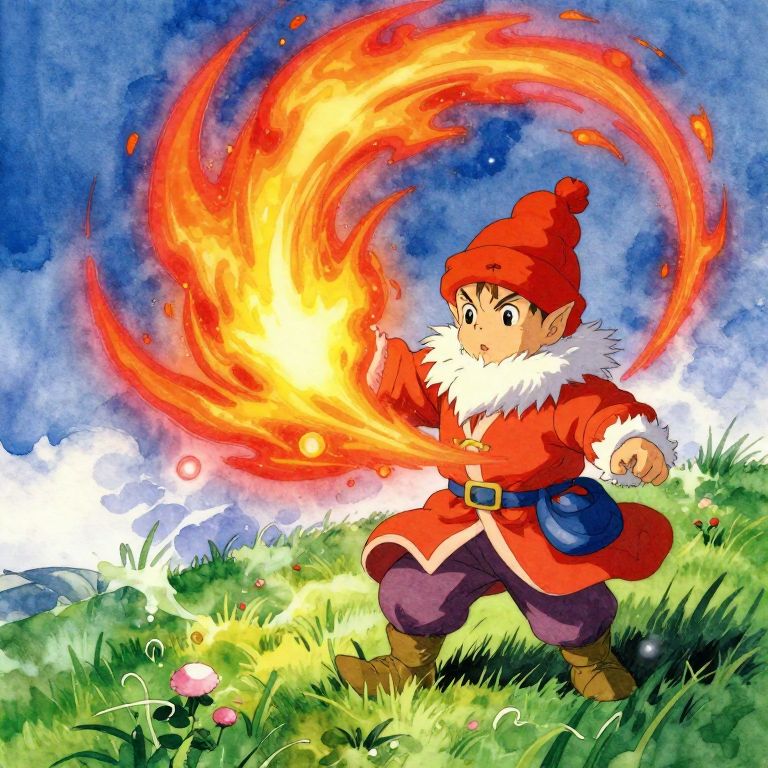 Dwarf handsome young fire mage is conjuring a vivid swirl of multicolored light, mountaintop meadow, watercolors:: style of mondrian, bruce weber, yoshitaka amano, brilliant colors::0.4,