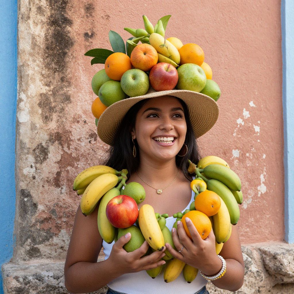 Photograph of a smiling young woman with dark, wavy hair wearing a large, woven straw hat adorned with various fruits like apples, oranges, and bananas. She has a light brown skin tone and is dressed in a white sleeveless top. More bananas and fruits are draped over her shoulders and chest, which she holds with both hands. She wears a gold necklace, hoop earrings, and a white bracelet. The background features a textured, weathered pink wall with blue trim, adding a rustic charm to the vibrant, fruit-filled scene. The woman's joyful expression and colorful attire create a lively, festive atmosphere.