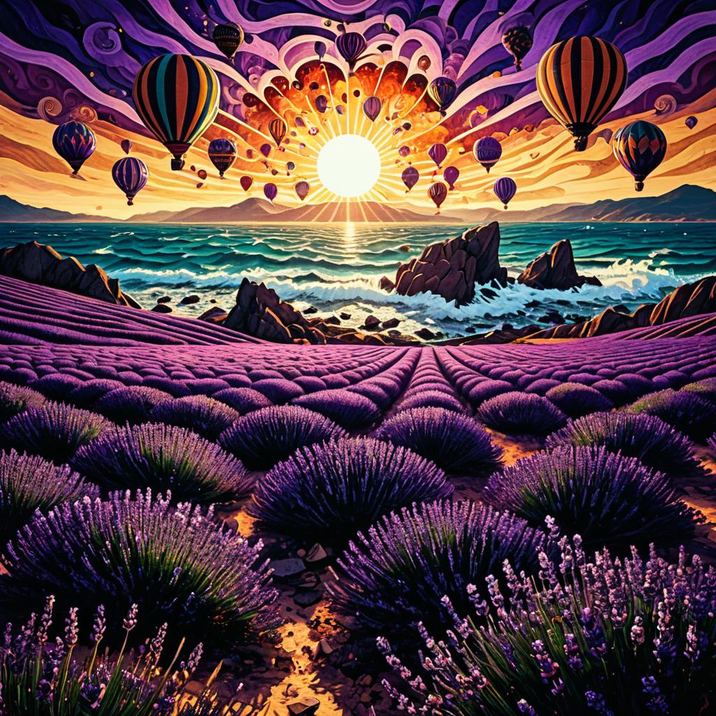 Steam-powered airship hovering above jagged mountains, stylized and surreal landscape, swirling sky with billowing smoky clouds, intense lighting with a large glowing sun, ocean waves crashing against rocks, dark and moody atmosphere, inspired by steampunk, vibrant colors and bold brushstrokes