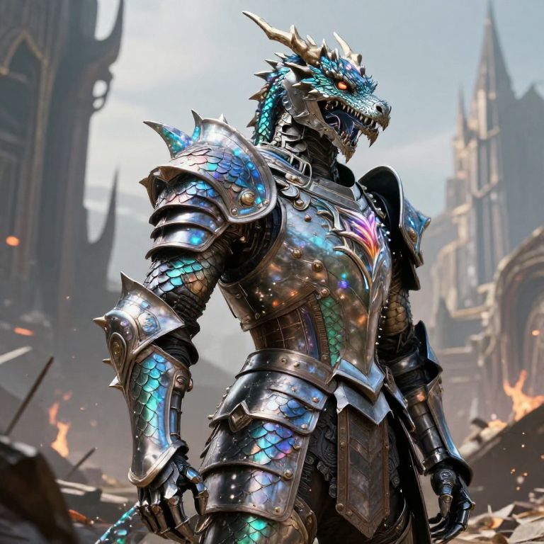 Dragon armor concept art showcasing a futuristic blend of medieval armor with dragon-inspired bio-mechanical features, scales shimmering in iridescent hues, a helmet shaped like a dragon's head, luminous energy veins running through, against a backdrop of a war-torn fantasy cityscape.