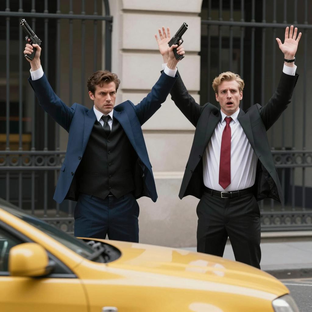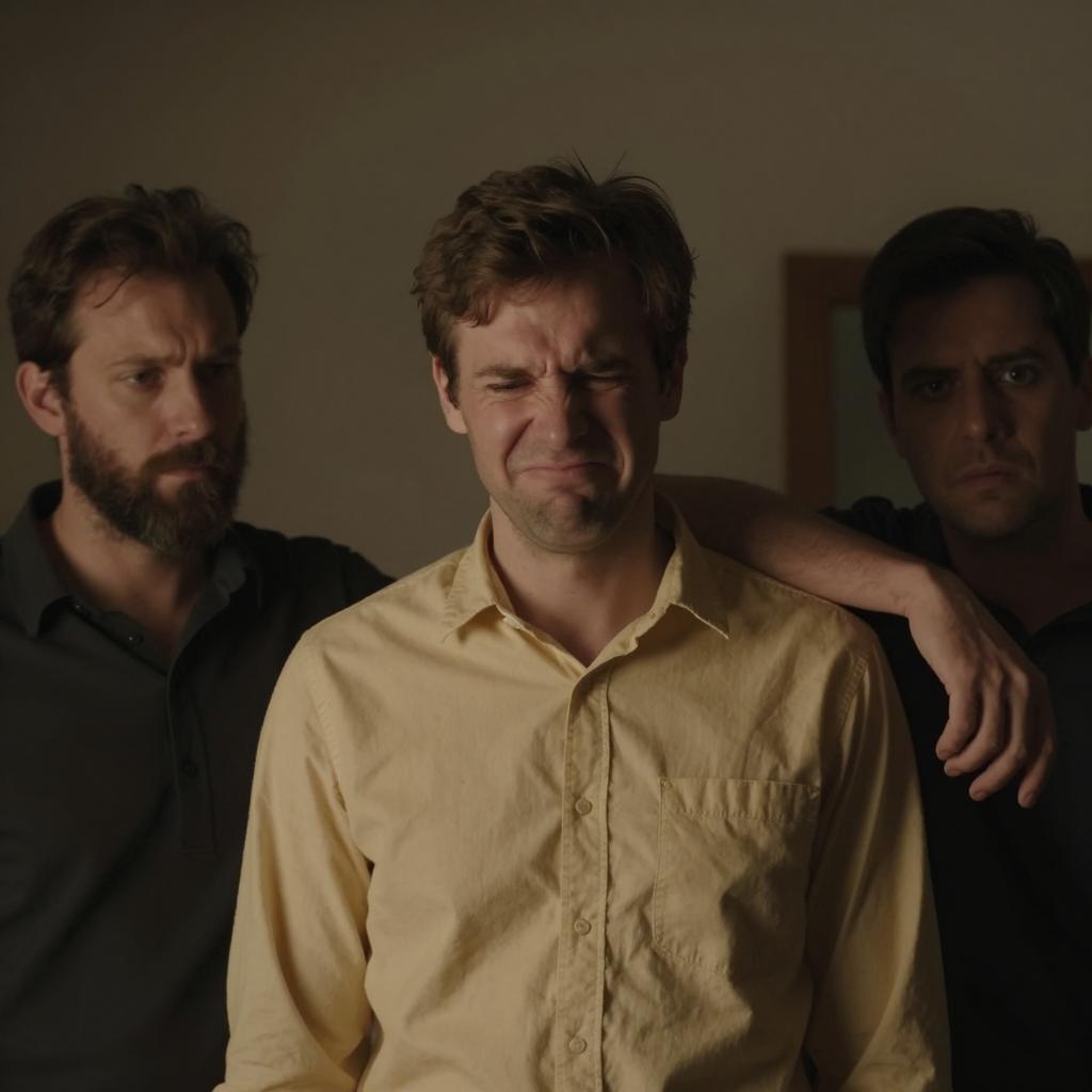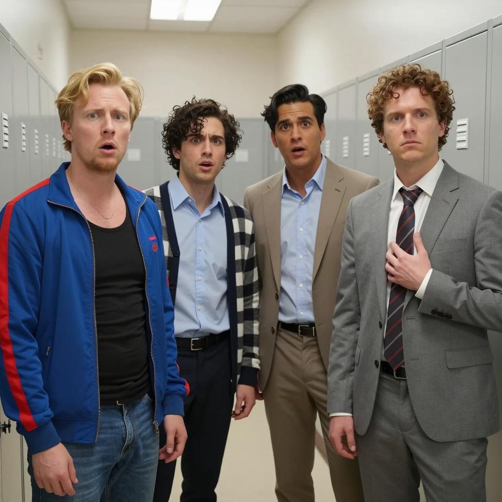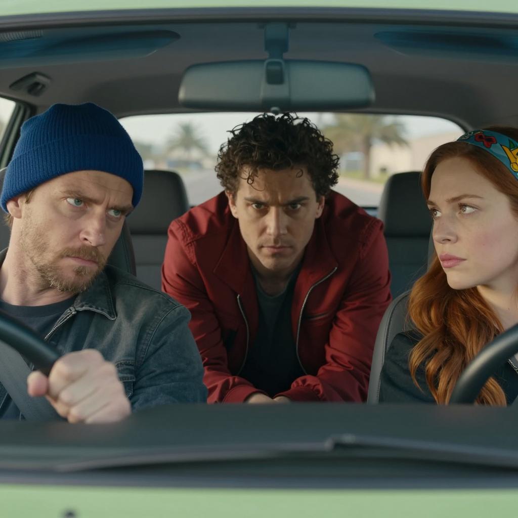 Four men in a vintage car with red seats. Driver in gray jacket, white shirt, gripping steering wheel, intense expression. Passenger in white sunglasses, brown jacket, open mouth. Two other passengers, brown jacket, gray jacket, shocked expressions. Background: blurry urban street, green tree, building with poster. Window frame in foreground.