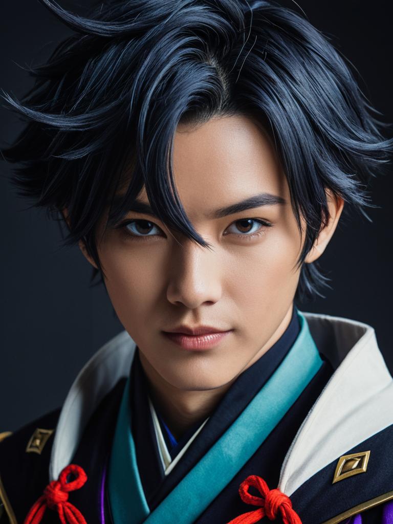Man in Childe Genshin Outfit, close-up detailed headshot with styled hair