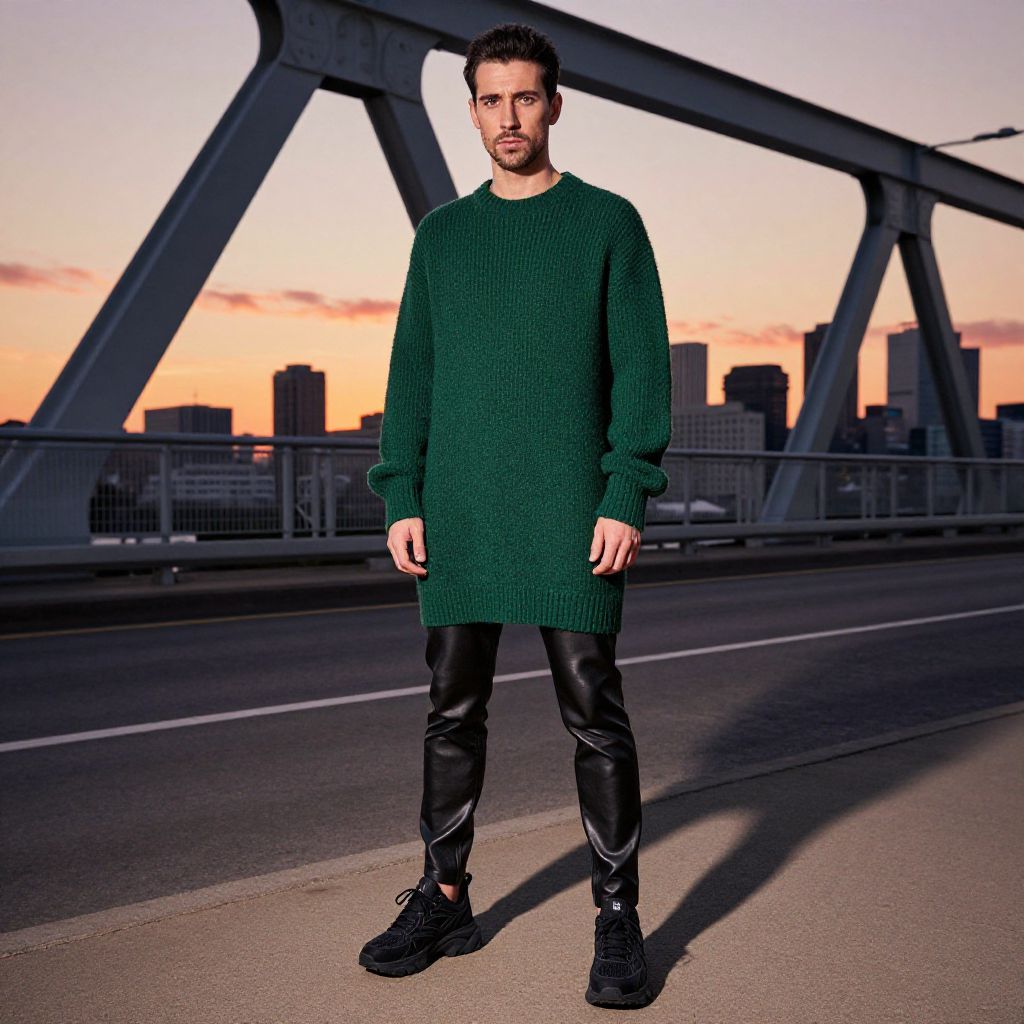 A man, long oversized deep green sweater, textured wool, matte leather leggings, chunky black sneakers, alternative fashion, modern steel arch bridge, city skyline in the background, vibrant sunset casting shadows, overhead shot, contemplative expression. Man has masculine face and piercing eyes