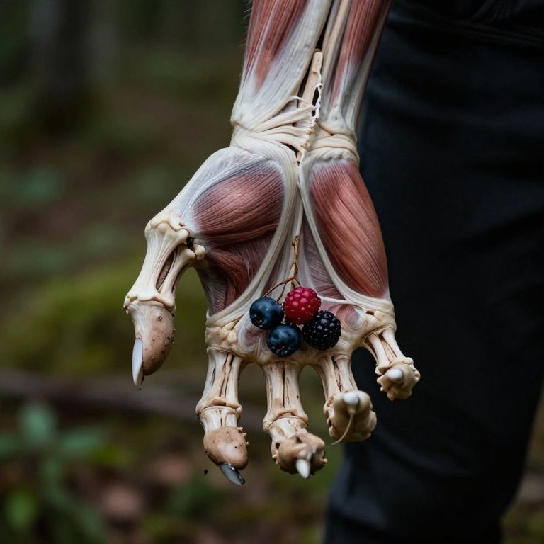 Skinned bear paw holding berries in a forest setting, delicate muscle texture and exposed tendons visible, soft natural light, dark moody color palette